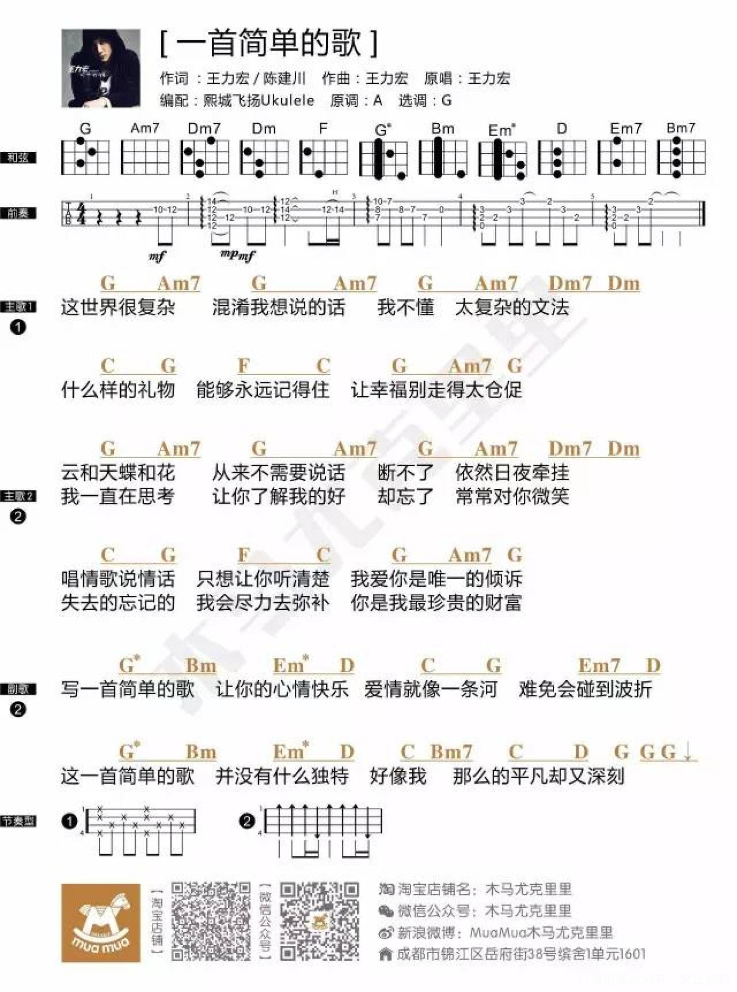 曲谱介绍: 今天和你分享的歌曲是王力宏在2004年发行的专辑《心中的日月》里一首大家非常喜欢的简单情歌——《一首简单的歌》。一首简单的歌,一种简单的情殇,淡淡的字眼里流露出对爱情的执着,柔美的曲风中夹杂着淡淡的情怀,是对爱的专一,是对自己的告白。 这首歌写了力宏对生活的一种态度,这个世界很复杂,也许会让人无奈,但是还是要努力把握幸福,不需要太刻意地表现爱,只要用简单的方式表达。“一首简单的歌,平凡却又深刻。”便已足够。 在尤克里里版曲谱编排上面,男生版原调是A调,选调是G调,目的是为了大家高把位和弦好按些,需要注意的是和弦右边加*号的是推荐弹法,目的是为了大家演奏更顺畅,如果大家觉得和弦指法自己驾驭不了,可以选用和弦的原始标准按法。