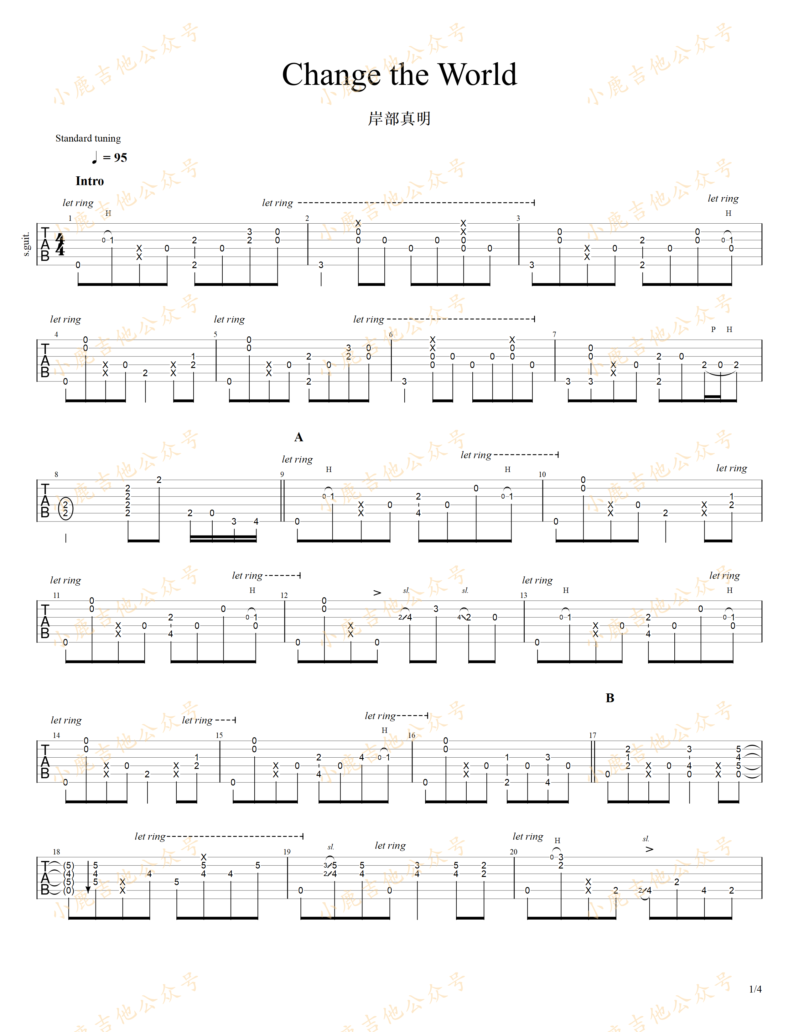 曲谱介绍: Change《ChangetheWorld-岸部真明》吉他独奏谱,共有4张高清图谱。