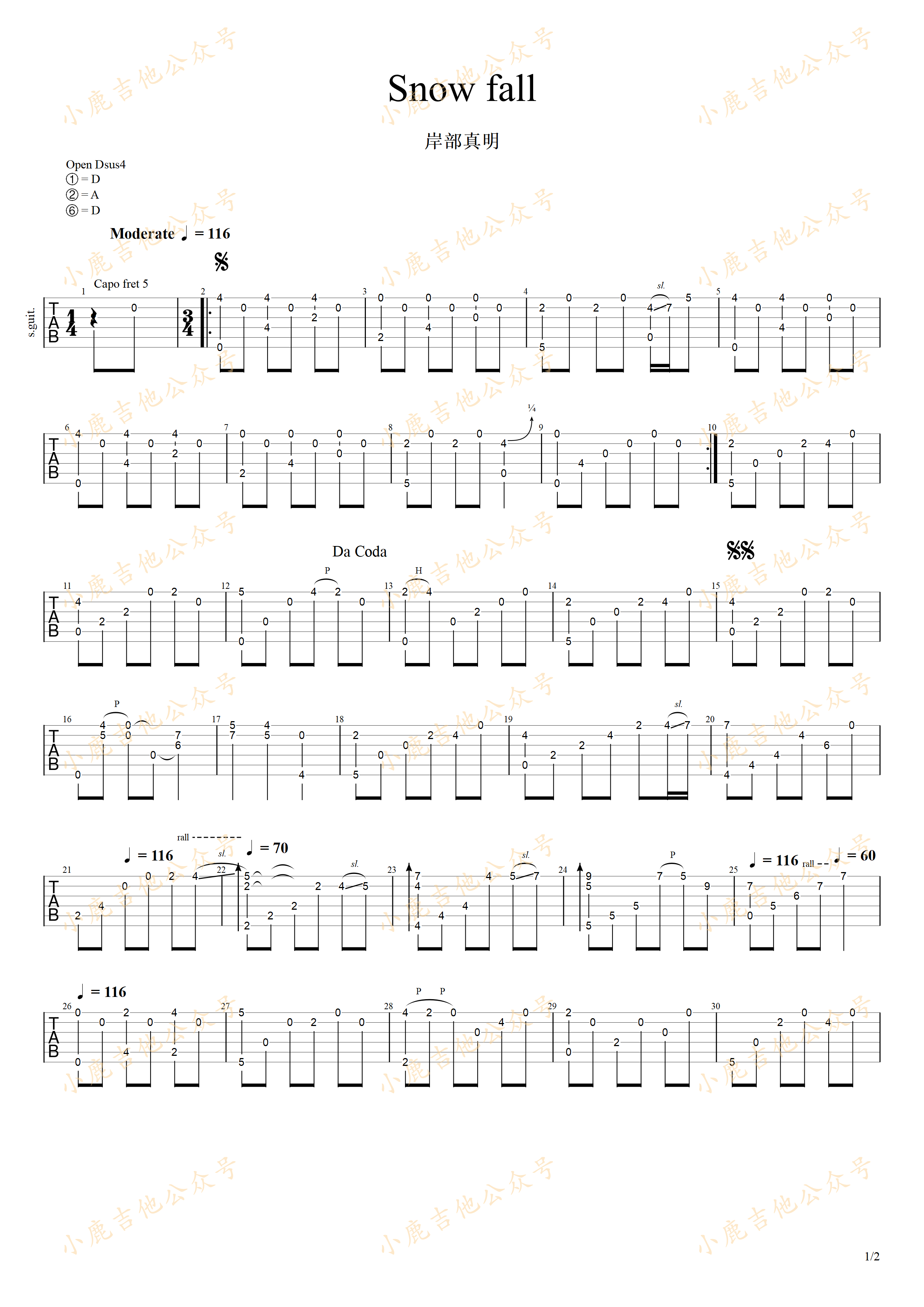 曲谱介绍: Snow《Snowfall-岸部真明》吉他独奏谱,共有2张高清图谱,免翻页排版设计。