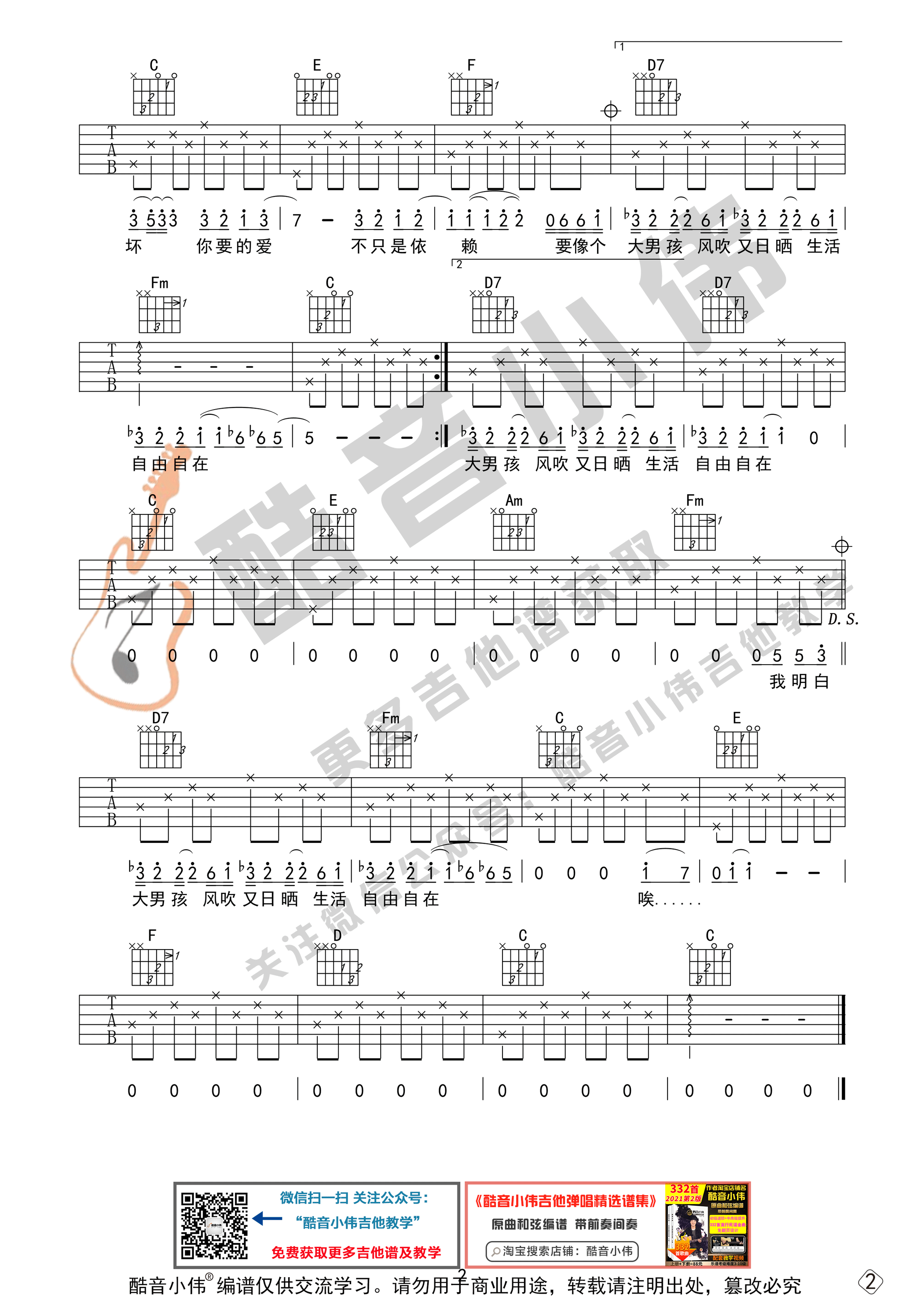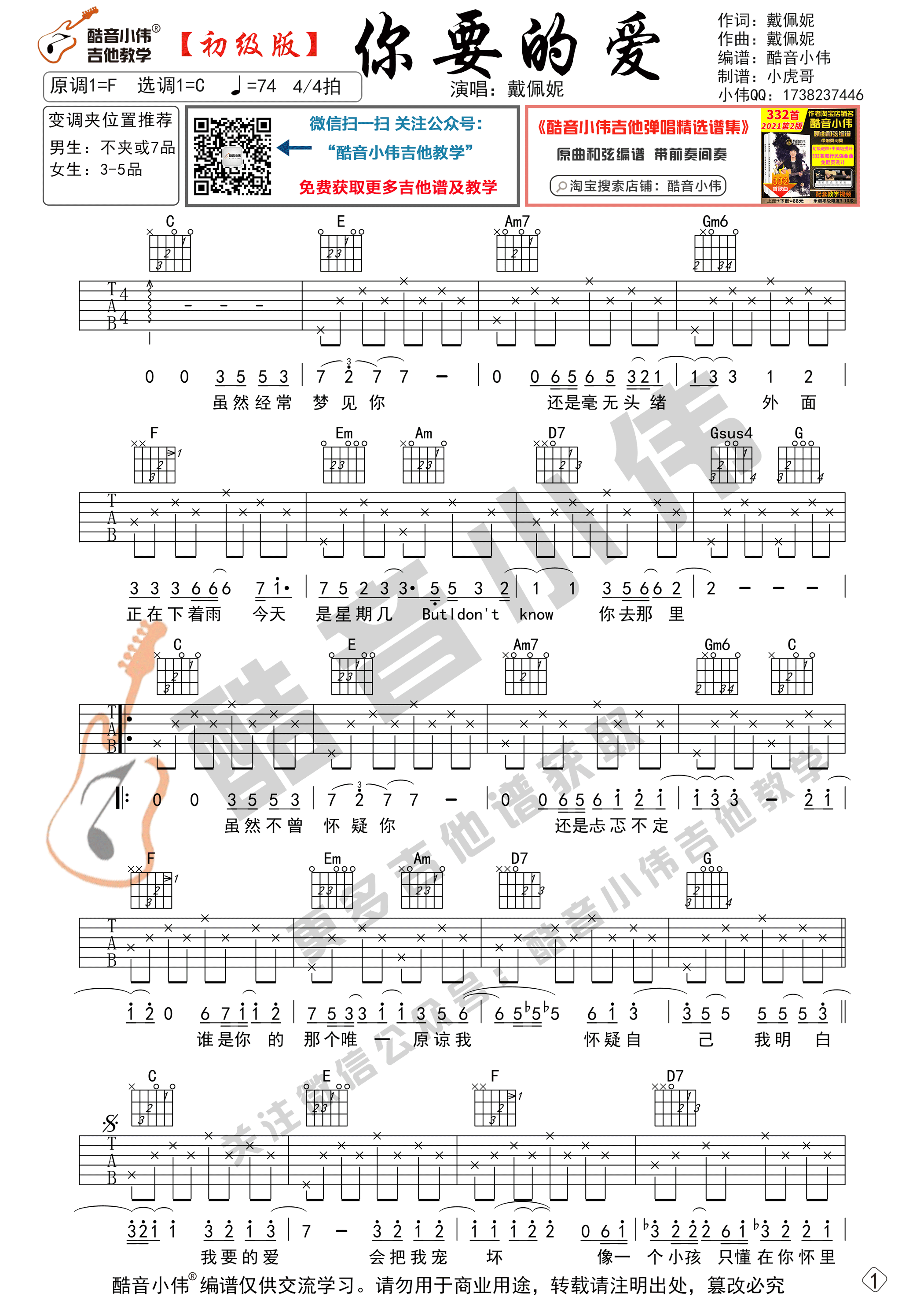 曲谱介绍: 曲谱适合初学者练习,选用C调指法,变调夹的位子可以根据我的推荐来选择。使用分解伴奏型,先弹奏会曲谱,再清唱会,然后弹唱结合一起练习。在01年《流星花园》热播的时间里,戴佩妮用一首《你要的爱》风靡全台。随后推出经典歌曲怎样为自己赢得了一批忠实的歌迷。 好声音口碑的没落,新时代音综的崛起,戴佩妮完胜张碧晨 在随后的两年里,戴佩妮决定趁热打铁相继推出两张专辑,其中《爱疯了》更是她哥坛生涯的代表作。只是无论她再怎么努力,最佳女歌手这个头衔都跟她有缘无分,多次入选入围奖却与奖项擦肩而过。
