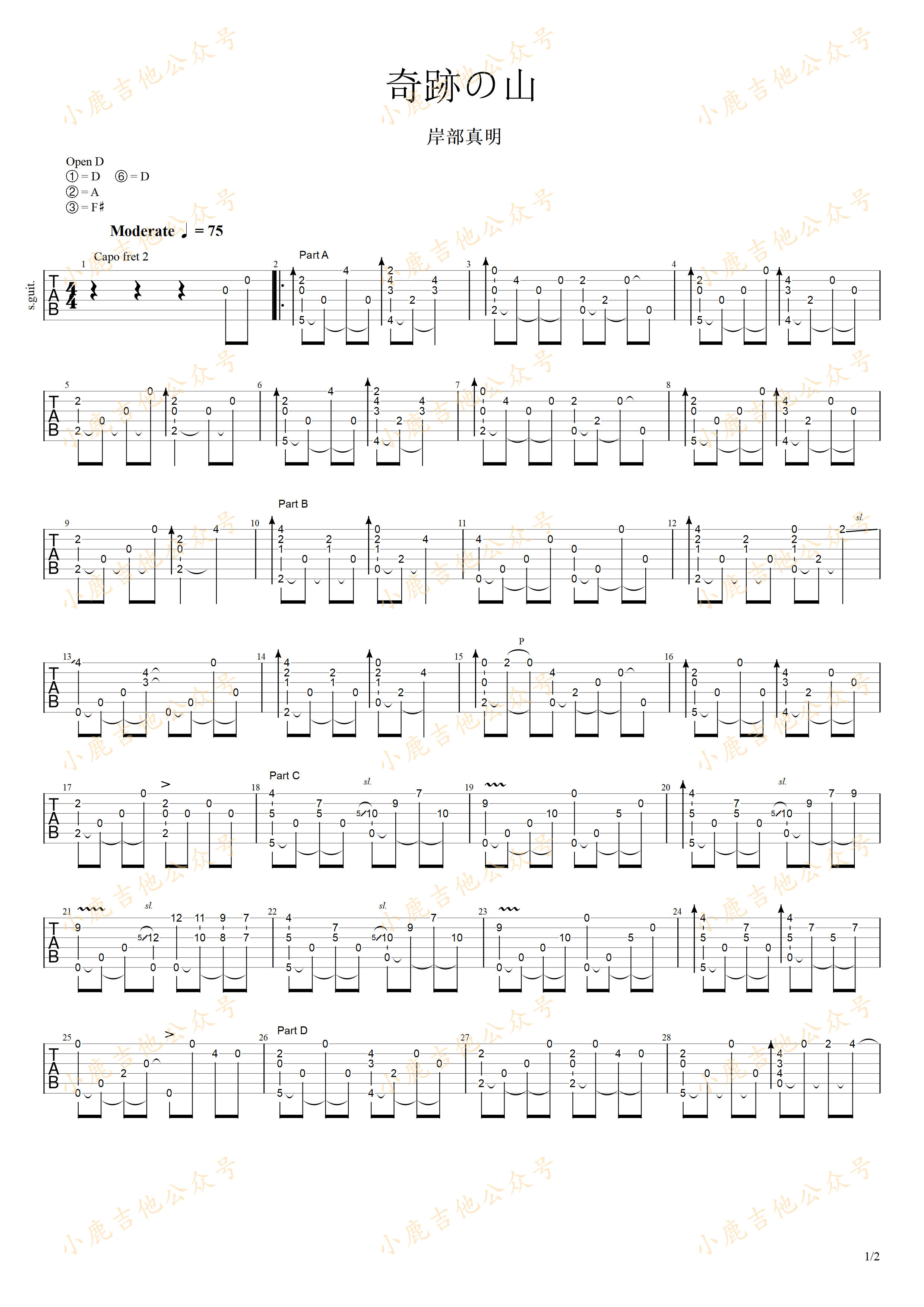 曲谱介绍: 奇跡の山《奇跡の山-岸部真明》吉他独奏谱,共有2张高清图谱,免翻页排版设计。