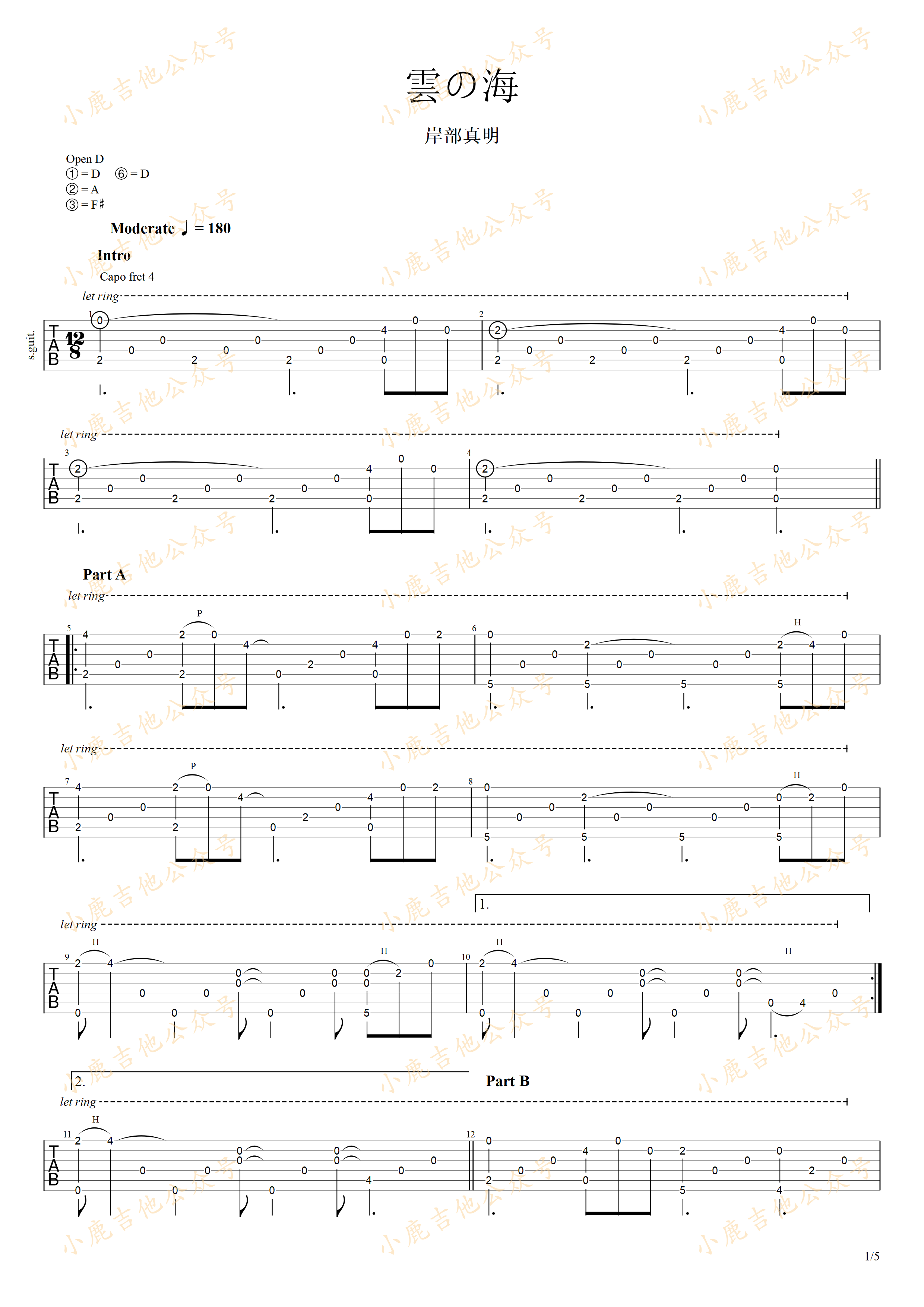 曲谱介绍: 雲の海《雲の海-岸部真明》吉他独奏谱,共有5张高清图谱。