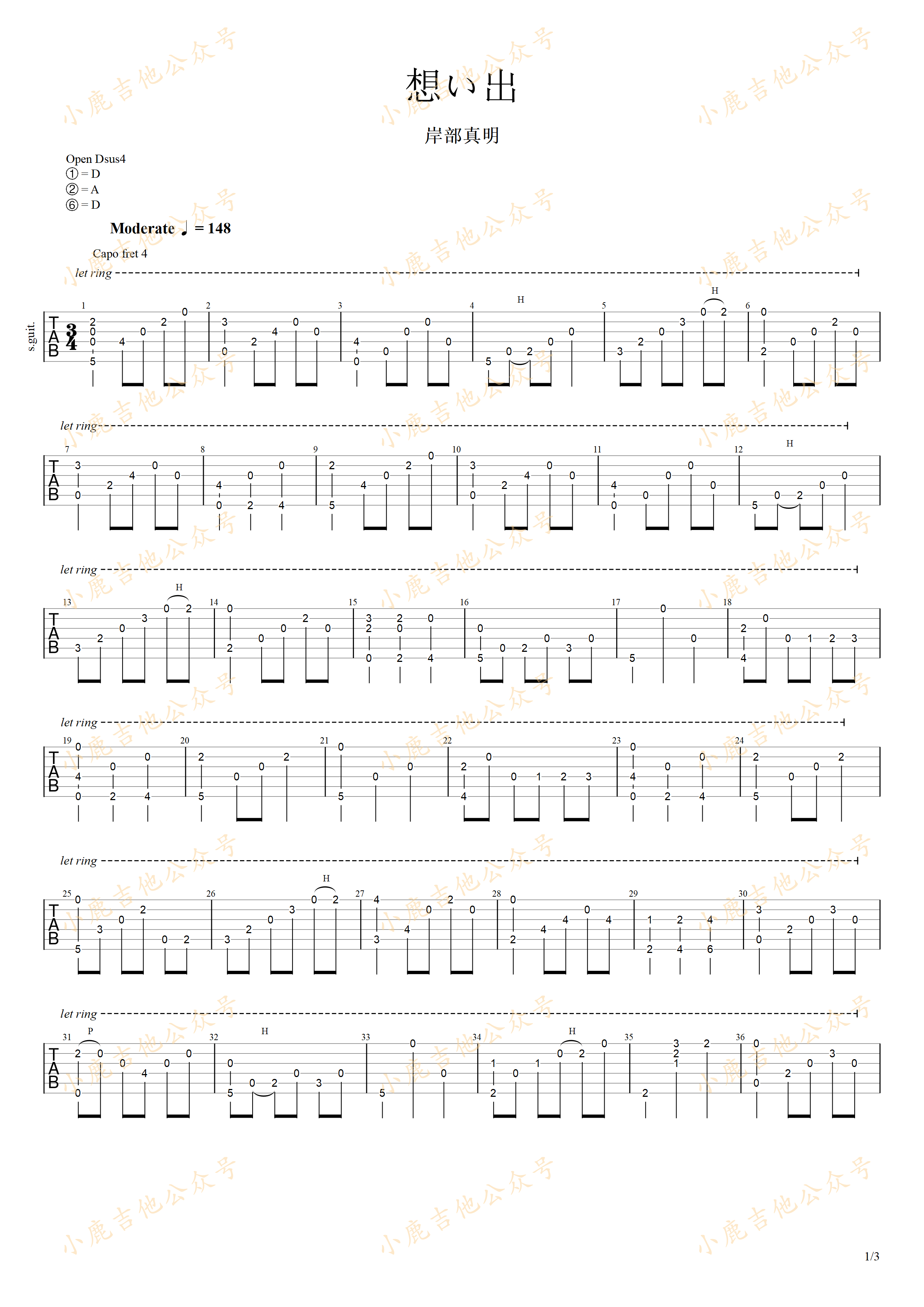曲谱介绍: 想い出《想い出-岸部真明》吉他独奏谱,共有3张高清图谱。