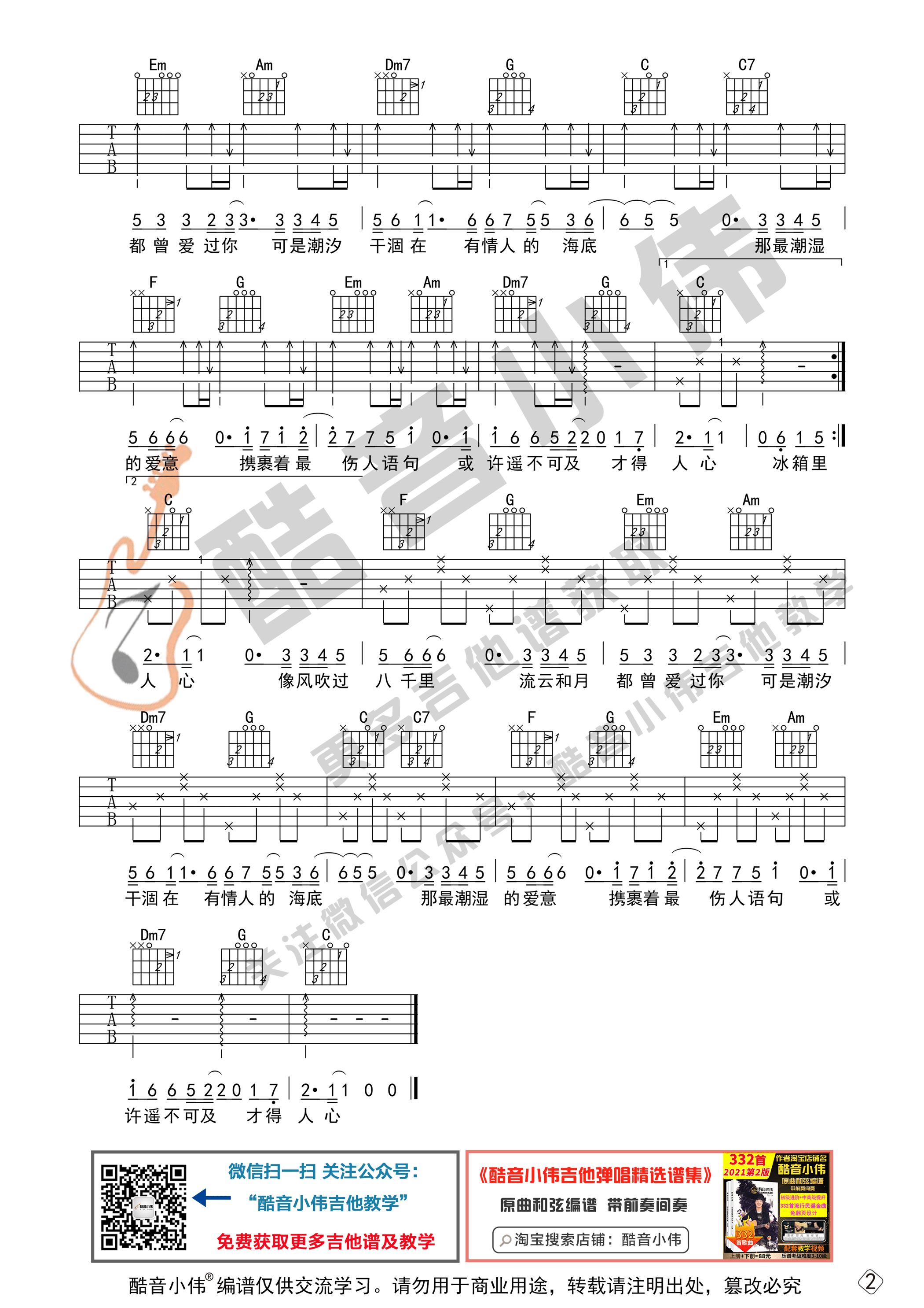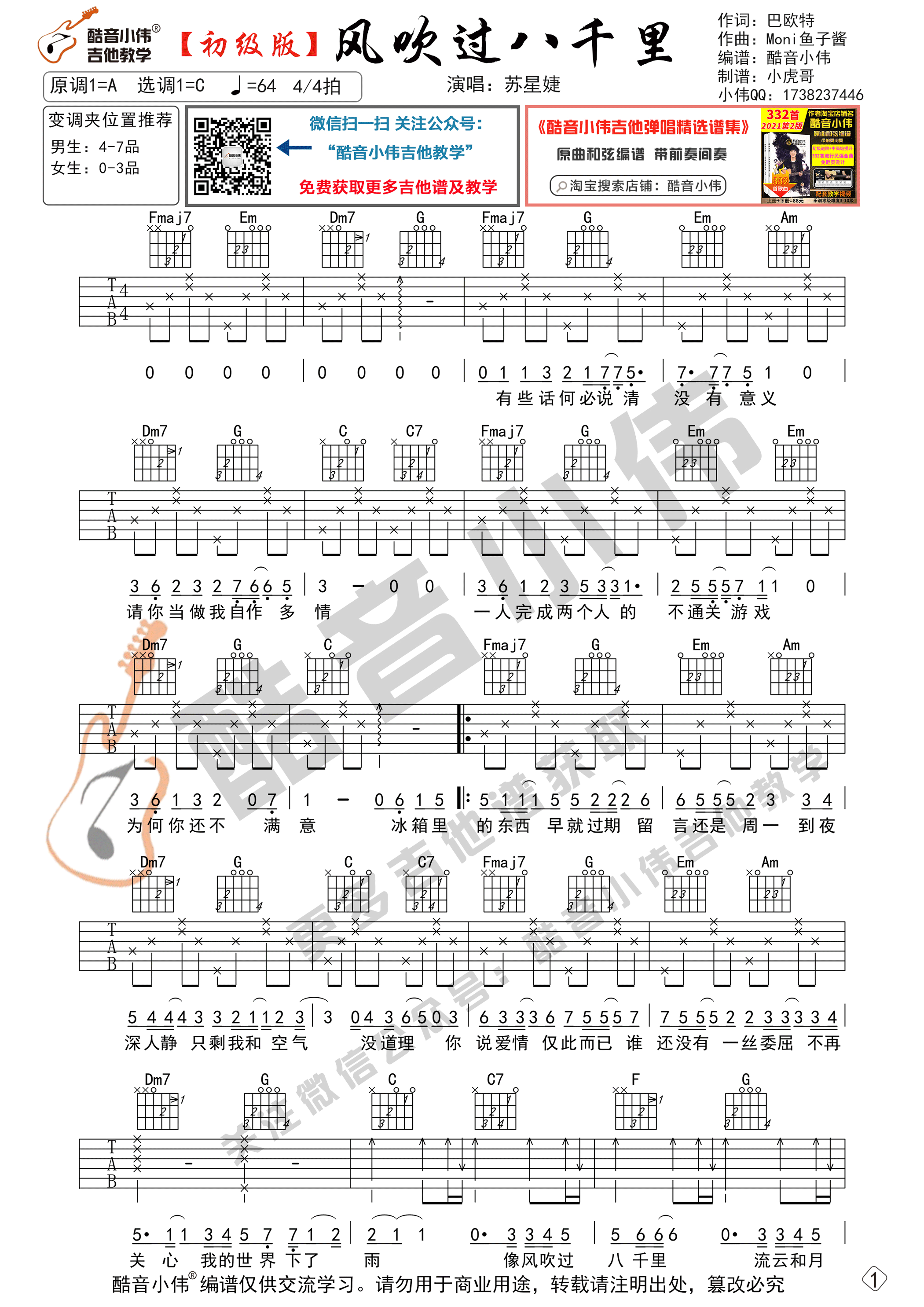 曲谱介绍: 《风吹过八千里》吉他谱谱采用了C调指法,由酷音小伟编配完成。曲谱适合初学者练习,选用C调指法,变调夹的位子可以根据我的推荐来选择。使用分解及扫弦伴奏型,先弹奏会曲谱,再清唱会,然后弹唱结合一起练习。