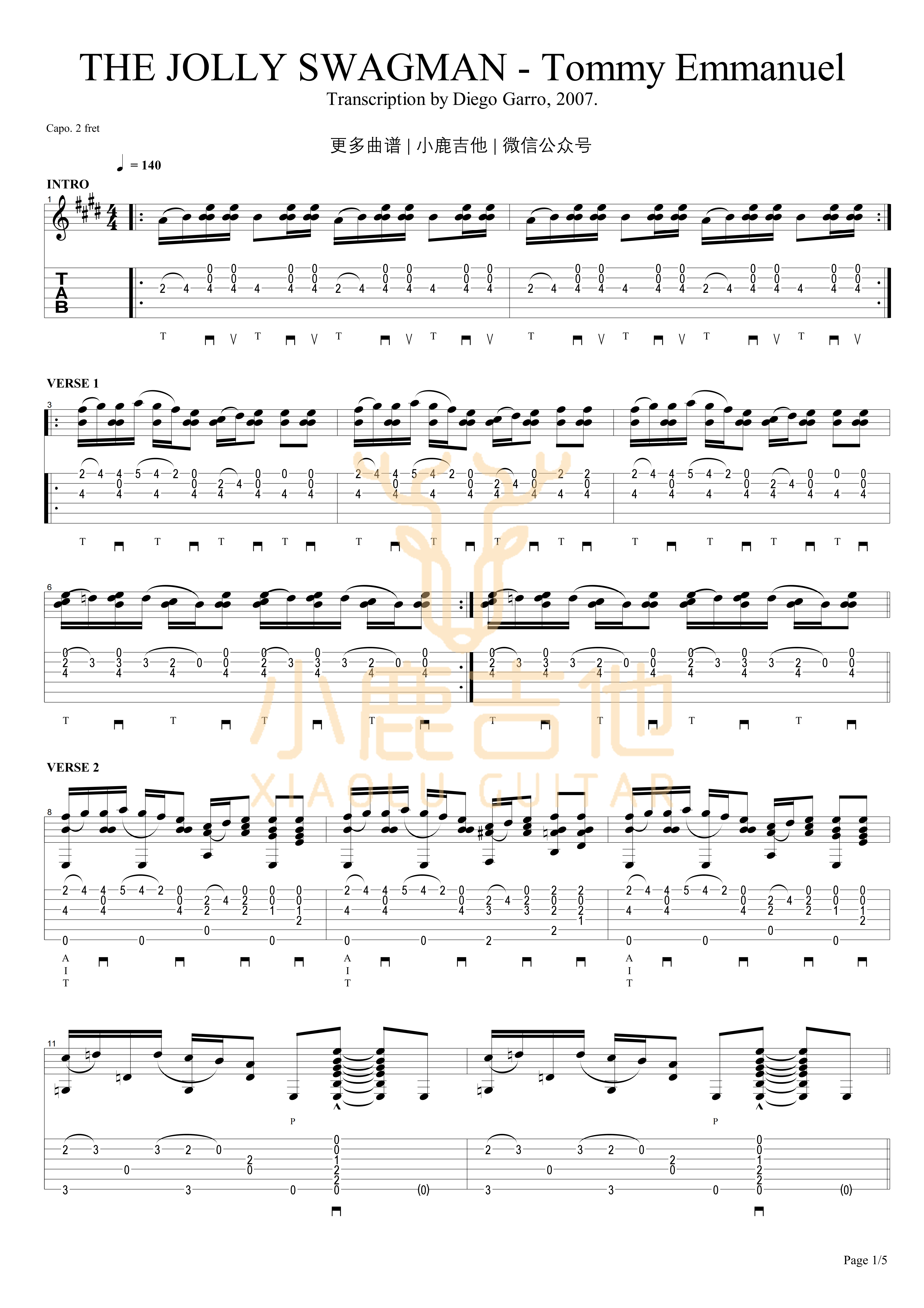 曲谱介绍: THE《THEJOLLYSWAGMAN-TommyEmmanuel》吉他独奏谱,共有5张高清图谱。