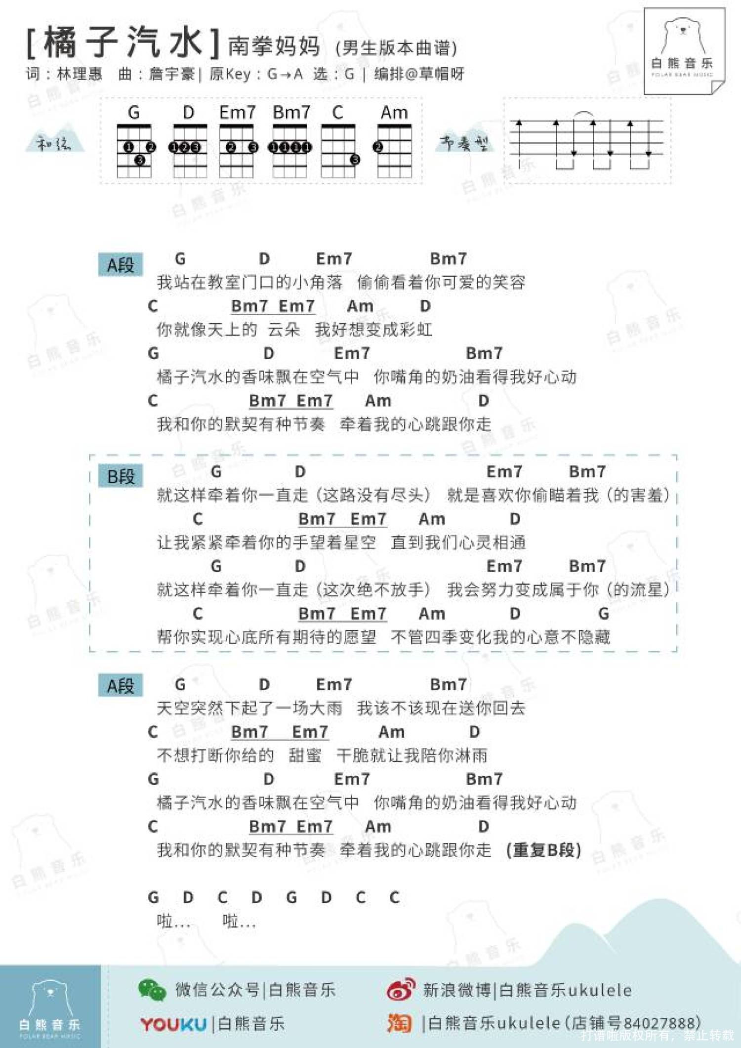 曲谱介绍: 白熊音乐推出全新栏目-「音乐早餐」,分享关于食物或充满正能量的歌曲,还有简单又美味的各种食谱; "音乐+早餐" 好好弹琴,好好吃饭, 活力满满地开启你的一天 推送于一日之晨-早上八点左右, 记得来吃这份「音乐早餐」 哦~ 〈橘子汽水〉是暑假里一首青春盎然的校园情歌,年轻羞涩、单纯的暗恋心情,是宇豪继香草吧噗之后的又一佳作。无论您是几年级生,这首歌绝对是一首活化心境、重返年轻的青春良剂。收录在南拳妈妈2005年发行的专辑《2号餐》中; 专辑『2号餐』,除了意指南拳妈妈的第二张专辑之外,更代表了新鲜、加值、加量、首选的”拳”新组合。新鲜-因为有新成员新朋友;加值-新旧成员的音乐交流,加上杰伦的品管认证;加量-12首丰富多元曲风的原创私货,有如一个超大加值汉堡餐,不但宇豪、弹头、张杰、LARA有各自的创作作品,前南拳妈妈团员的巨炮、盖瑞的创作也收录其中,电子与古典的巧妙融合、复古与庞克、摇滚与蓝调、五声音阶民谣曲风和POP抒情歌…等,丰富的音乐曲风让人惊喜连连,当然是夏天的首选; 值得一提的是,〈靠近一点点〉和这首〈橘子汽水〉 曲调相同,歌词不同 ;〈靠近一点点〉是南拳妈妈的LARA唱的,和〈橘子汽水〉 是相同的作曲者和作词人,收录在电视剧《恶作剧之吻》原声带中; 视频演示 视频教学 尤克里里曲谱