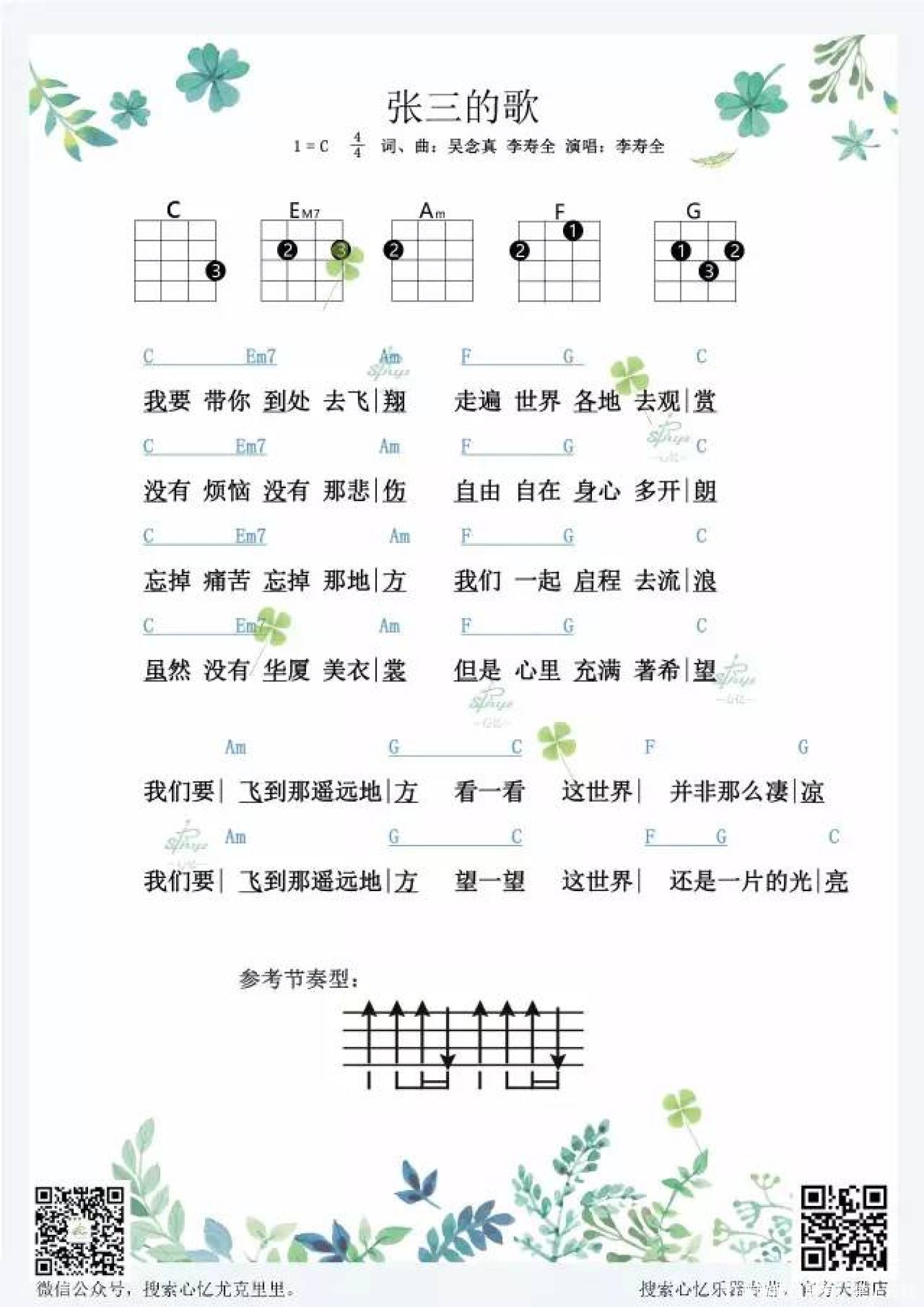 曲谱介绍: 张三, 是李寿全为他歌里所唱的小人物所起的名字, 也正泛指了大时代背景下的每一个我和你。 《张三的歌》是1986年出品的电影《父子关系》的主题曲,电影的故事和歌曲相当的应景,像是天造地设般的绝配,而这首歌的创作者张子石在写这首歌的时候刚在美国办了离婚手续,带着两个孩子流浪在异国他乡,颠沛流离,饱尝辛酸。 歌中的“张三”也并非是他自己,而是代言了所有张三李四一样的小人物,张三和李四就像是身边的你和我。   齐秦用他的人生阅历, 用他的情感扮演你和我, 唱出每个人心底角落的那个声音, 让人们在艰辛的生活中 要一直保有希望。 齐秦演唱版本 尤克里里曲谱