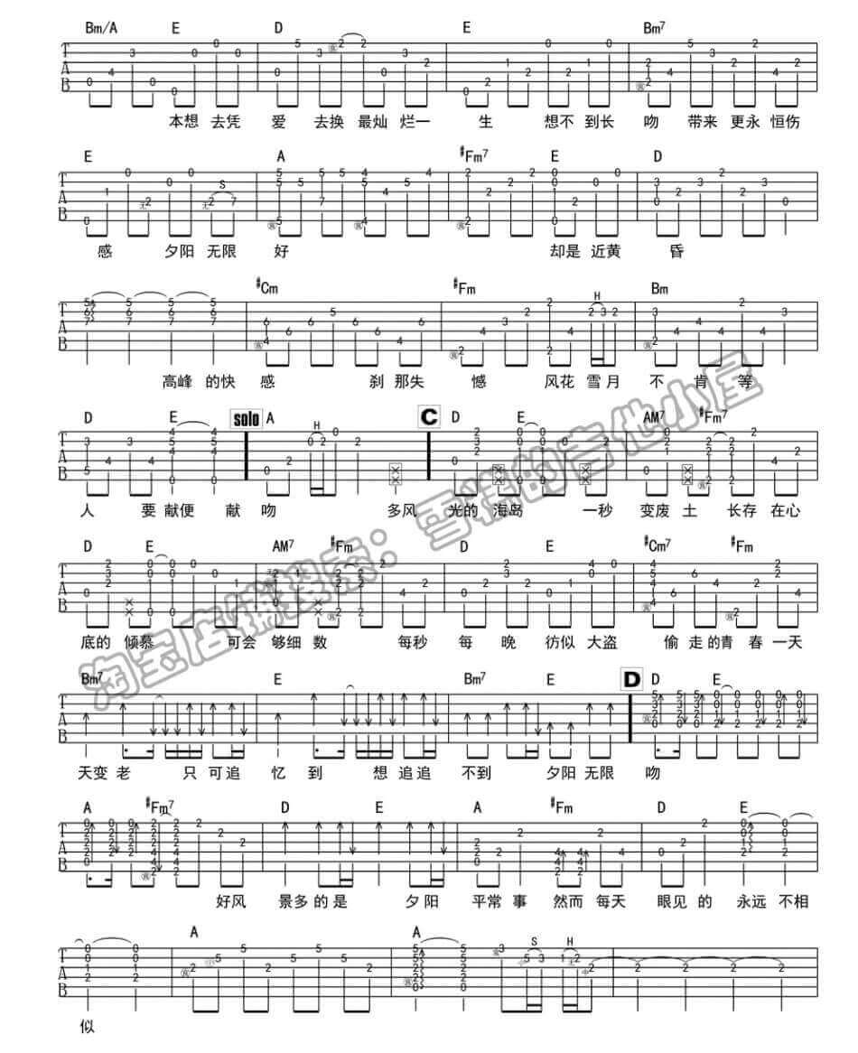 曲谱介绍: 夕阳无限好采用D调指法。作词人林夕写过许多脍炙人口的经典歌曲,这首《夕阳无限好》是在好朋友梅艳芳去世之后,为了纪念梅艳芳,并告诉歌迷要懂得珍惜眼前人,也许一次的错过,就会造成以后的后悔和悔恨。歌曲开头的旋律优美,能够一下子就把听众带入回忆,想起曾经埋在心里的遗憾。每个经过感情和生活的人都会有不一样的故事,加上陈奕迅的演绎,升华了歌曲的内涵。号外:在这里小编要推荐这首赋别曲吉他谱,它也很好听,大家赶快学习起来啦,不要犹豫!