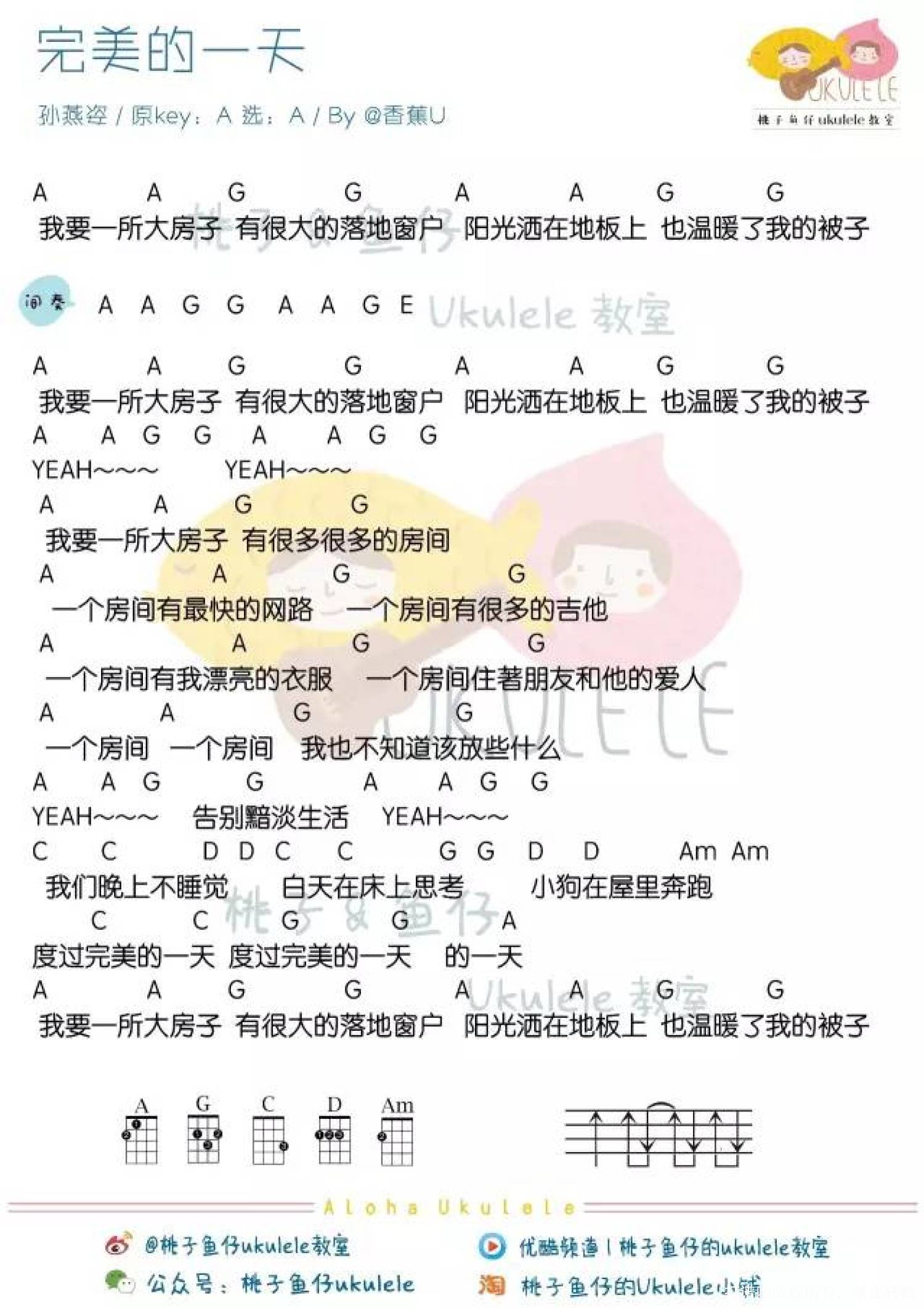 曲谱介绍: 《完美的一天》是新加坡歌手孙燕姿演唱的一首歌曲,由虞洋作词作曲,收录于孙燕姿第九张个人专辑《完美的一天》。 2006年10月,该歌曲获得第6届全球华语歌曲排行榜二十大最受欢迎金曲。 《完美的一天》的创作灵感来自孙燕姿心目中所向往的“完美一天”,作词人虞洋把孙燕姿所想用文字描述了出来。作曲方面,虞洋在歌中融入了一些摇滚融合电子的元素 尤克里里曲谱