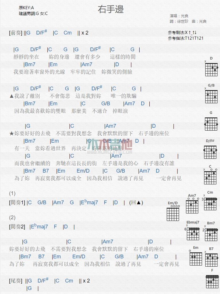 曲谱介绍: 右手边《右手边_》吉他弹唱谱,共有1张高清图谱,免翻页排版设计。