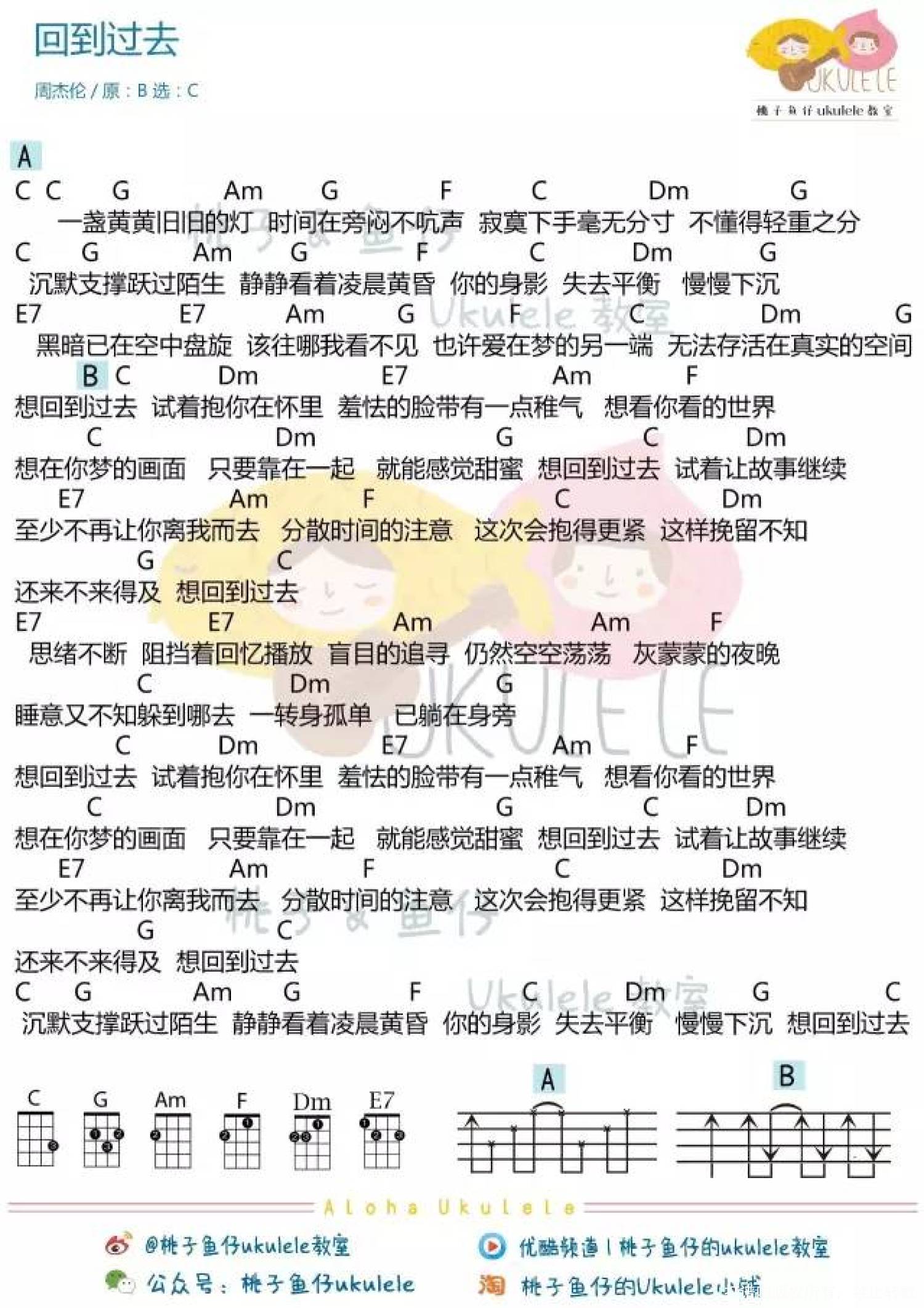 曲谱介绍: 《回到过去》是周杰伦演唱的一首歌曲,由周杰伦作曲,刘畊宏作词,收录于周杰伦2002年的个人专辑《八度空间》中。 2003年,该曲获得了2002十大劲歌金曲最受欢迎国语歌曲奖金奖。 《回到过去》是刘畊宏跨刀写词的作品,当时刘畊宏是咻比嘟哗的成员,特意为同门师兄弟周杰伦写下这首歌词。而刘畊宏写这首歌词是为了表达出一个人在夜深人静时悼念爱情的孤单感受。为了更好呈现这首歌曲,刘畊宏也担当制作了《回到过去》的MV。周杰伦为了让歌曲在录音上呈现出亮点,在结尾部分采用了模仿老式收音机的特效。 尤克里里曲谱