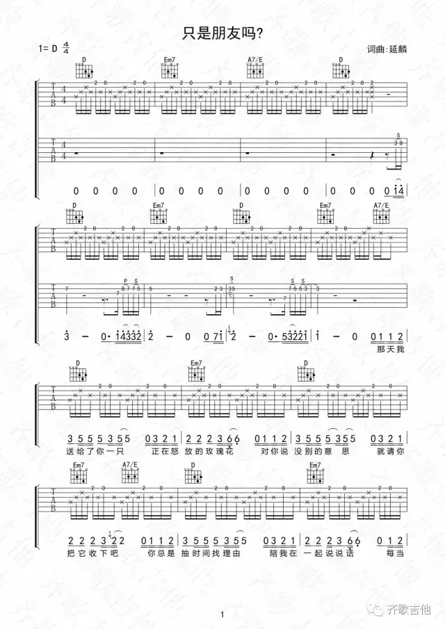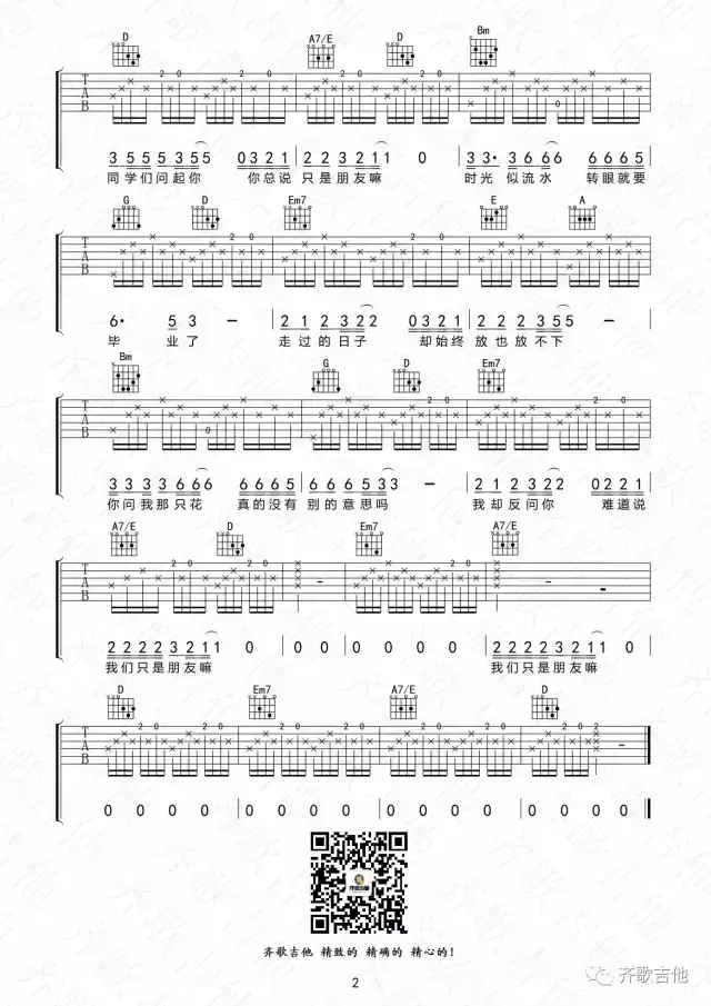 曲谱介绍: 只是朋友吗吉他谱采用了D调指法,由齐歌吉他编配完成。号外:在这里小编要推荐这首还有多少个十年吉他谱,它也很好听,大家赶快学习起来啦,不要犹豫!