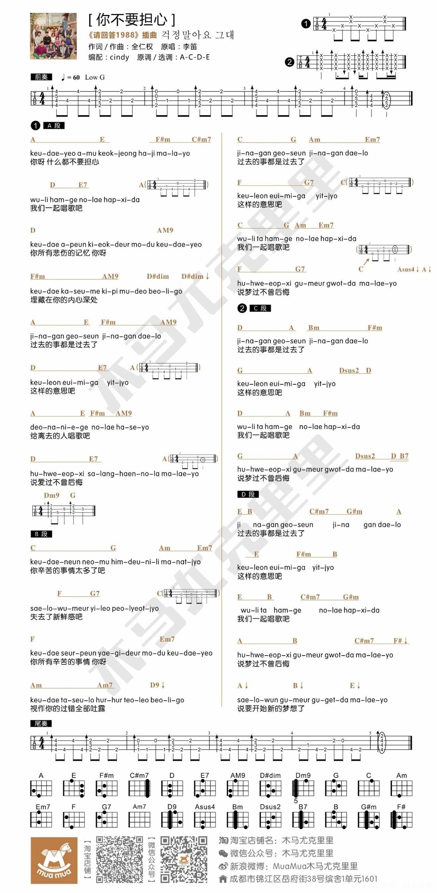 曲谱介绍: 《请回答1988》这部韩剧 真的不像韩剧 剧情平易近人到 分分钟代入你童年生活 最近好多不看韩剧的盆友 尤其是男生 都吃下了这剂安利 看过都说好! 而小编则是看到了台湾配音版 开始了2刷(原版) 依然觉得好好看! 本剧好听的歌曲太多 很多U圈好友都相继出了合辑 而今天小编推荐的这首 是每次听到都会被感动 旋律歌词都很质朴的 你不要担心 视频指弹教学 尤克里里曲谱 虽然和弦很多 是因为原曲移调了3次 所以出现了很多和弦 但和弦走向是完全相同的 小编吐血扒谱 飞扬大大爆肝制谱 求好评! 来看我双门洞发小&正峰哥哥