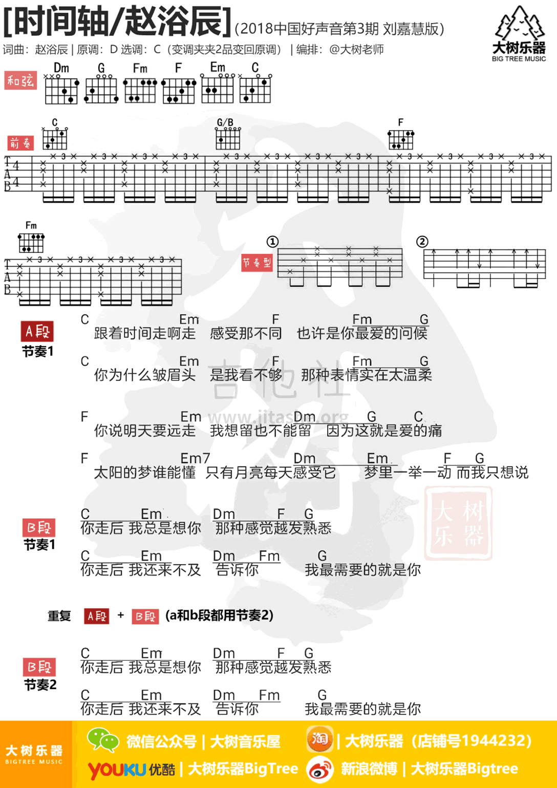 曲谱介绍: 时间轴吉他谱采用了C调指法,由大树音乐屋编配完成。刘嘉慧是那种一开口演唱就能惊艳人的歌手,听她唱《时间轴》这首歌曲简直就是一种特别的享受,她的声音听起来是那么舒服,同时很有磁性,她的音色的特点很突出,一首《时间轴》演唱下来让人听得如痴如醉,而且,她的声音有特色不张扬,她有较好的演唱技巧但却不刻意,再加上情感的拿捏到位,让这首作品受到了很多人的喜爱,让人想要一直循环下去。听说,有魅力的帅哥美的都在悄悄练这首南国的孩子吉他谱,小伙伴们也快练起来吧~