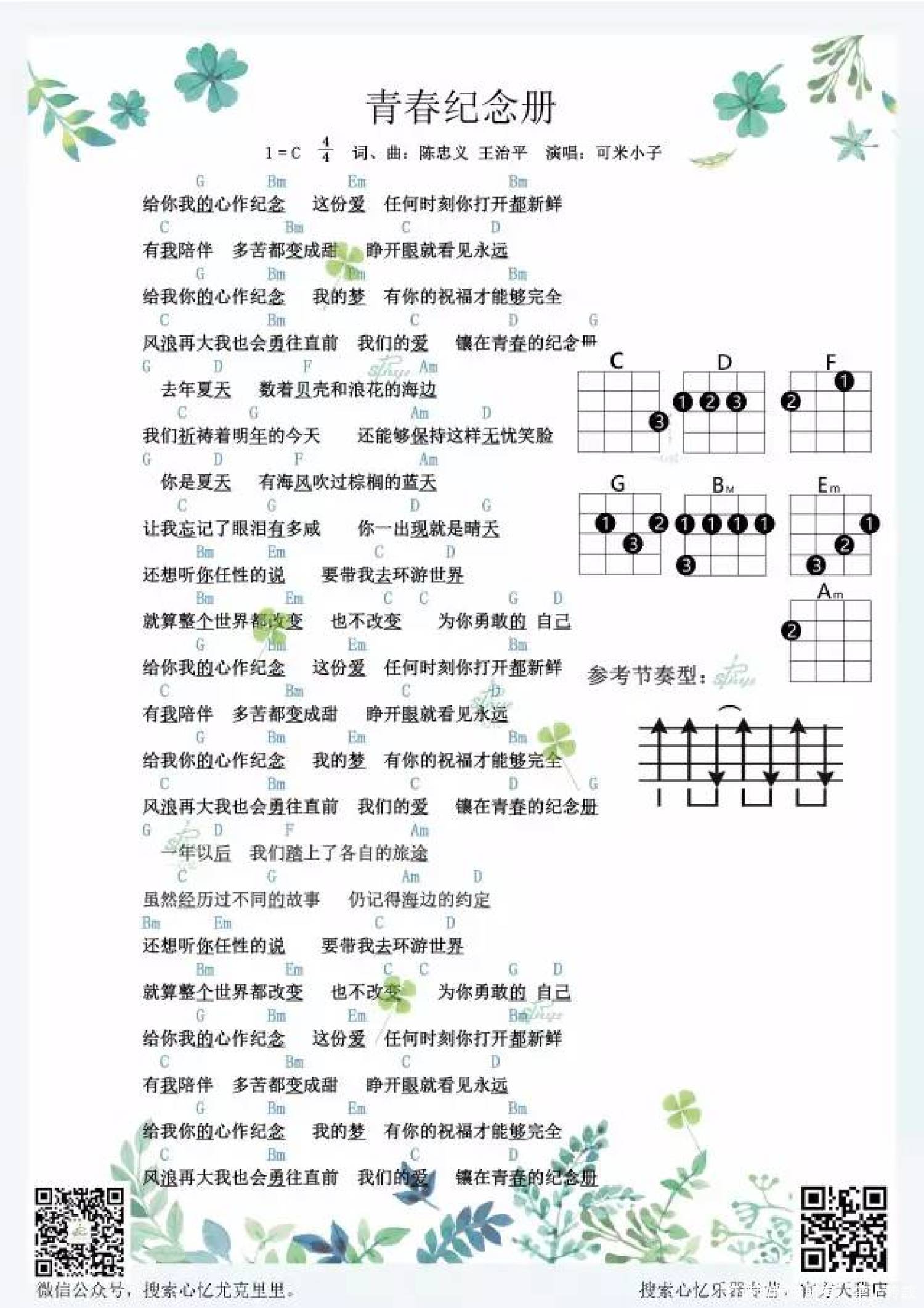 曲谱介绍:   因为青春, 我们用力深呼吸,用力作梦。 因为青春, 我们不怕失败,努力往前飞。 因为青春, 我们有用不完的精力, Happy Together! 因为青春, 我们约定制造共同的回忆, 镶在青春纪念册。   又是一年毕业季,也许时光真的会模糊记忆,但美好青春将永恒刻在心上。 这首歌的和弦也是有一丢丢多,但是为了同窗挚友,非常值得学下来!   青春纪念册尤克里里弹唱教学   青春纪念册尤克里里谱1:   尤克里里谱2:     青春纪念册吉他谱