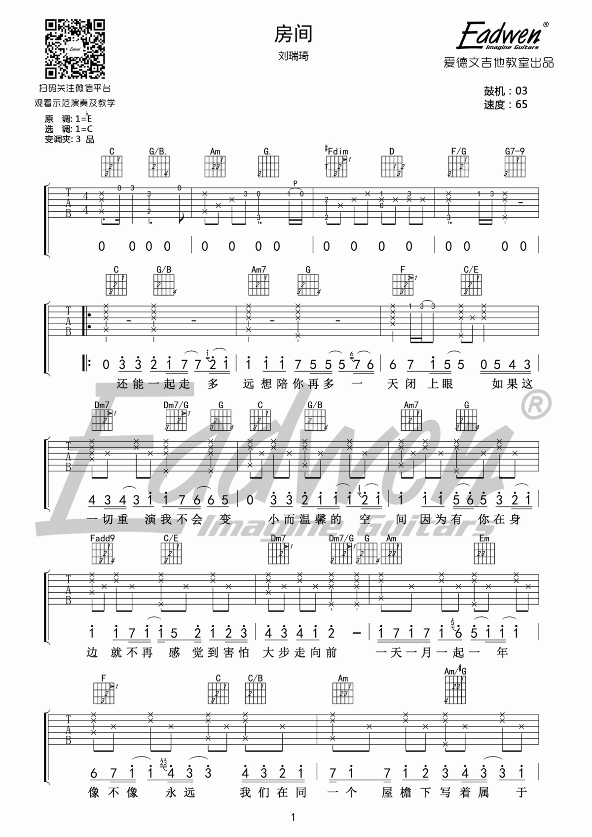 曲谱介绍: 刘瑞琪《房间》吉他弹唱谱,采用C调指法编配原版,共有3张高清图谱。