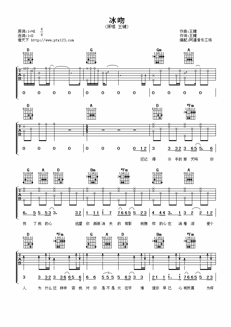 冰吻吉他谱 - 王健 - D调吉他弹唱谱
