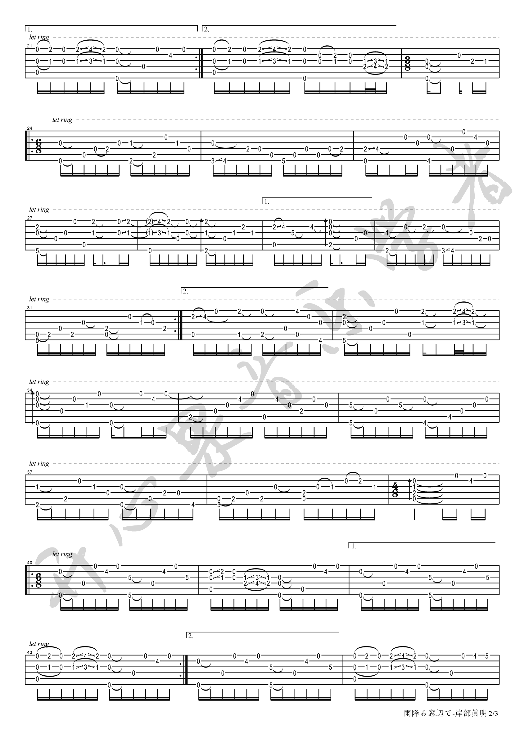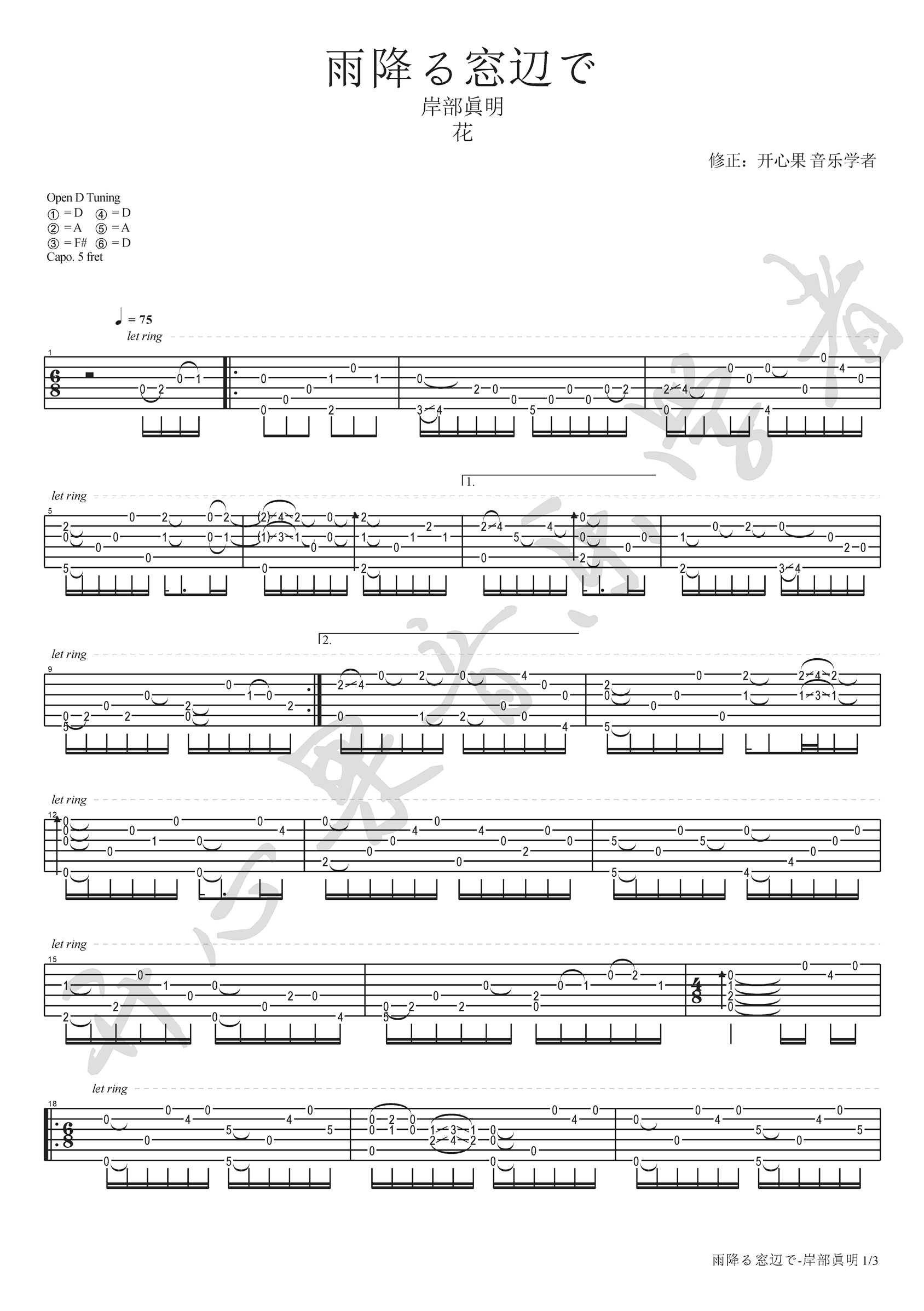 雨降窗边吉他谱 - 岸部真明 - D调吉他独奏谱