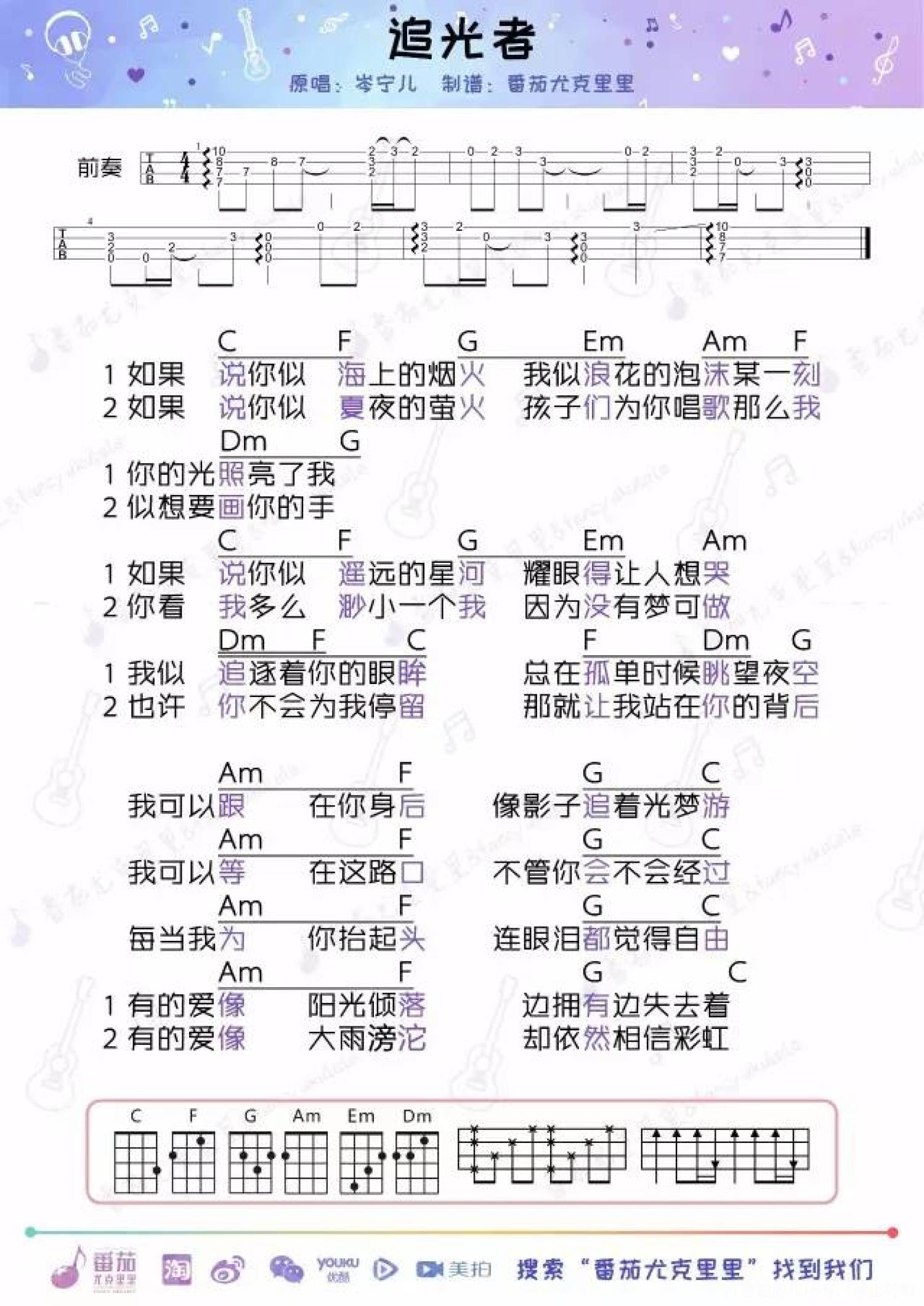 曲谱介绍:   《追光者》是电视剧《夏至未至》插曲,立夏人物曲。由唐恬作词,马敬作曲,岑宁儿细腻地唱出剧中角色立夏面对爱情委婉又小心翼翼的模样,诠释了这首歌盛满纯真的感觉,收录于专辑《夏至未至 电视原声带》中,发行于2017年06月16日。 “ 如果夏日的香气和热度 依然可以翻涌起你内心沉睡着的年代 如果香樟浓郁的树荫依然 抵挡不住太阳投射到眼皮上的红热滚烫 如果那些年少时寂寞的天空 还未曾完全走出你的梦境 ” 教学视频 尤克里里曲谱