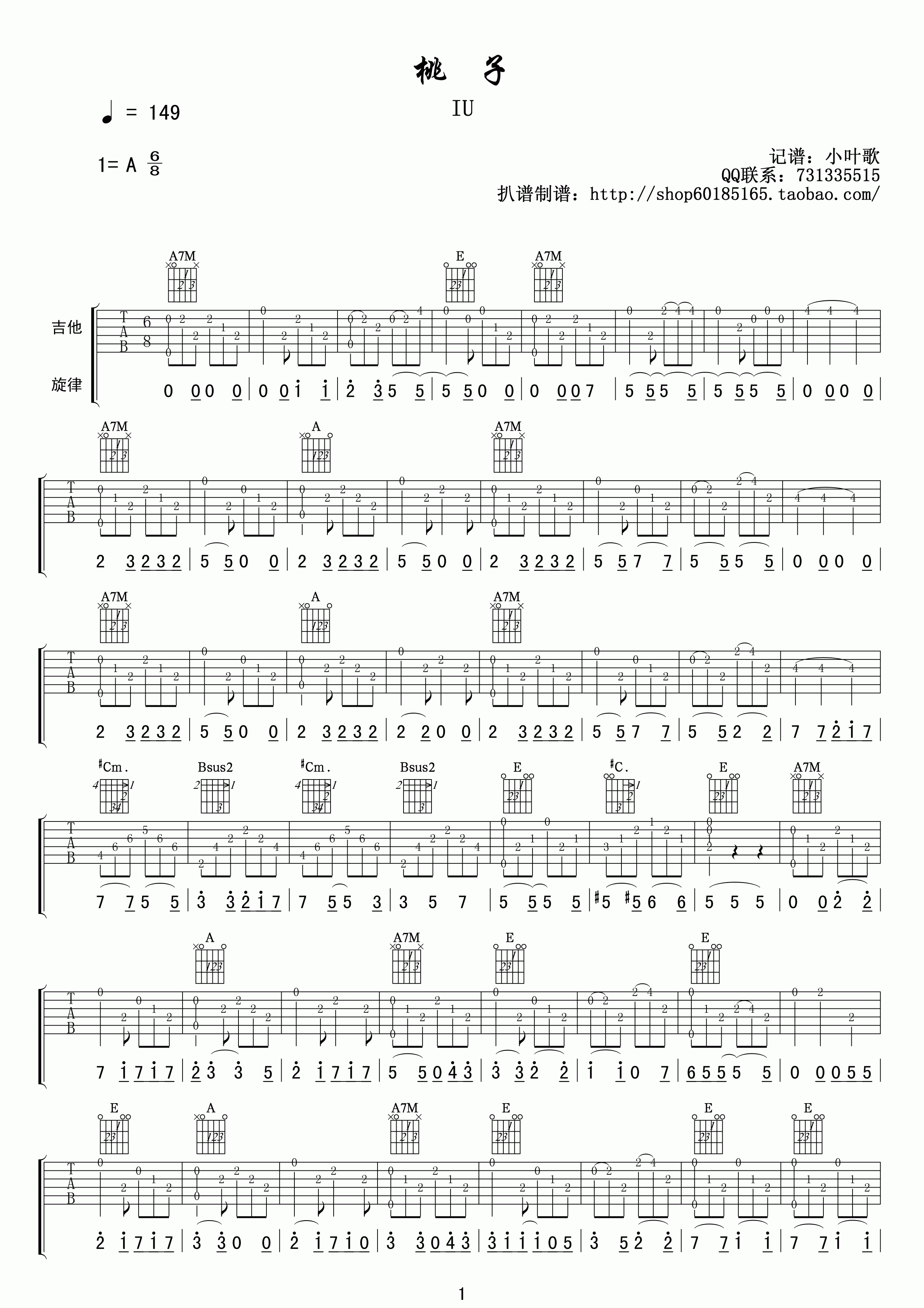 曲谱介绍: 桃子吉他谱采用了A调指法,由小叶歌吉他编配完成。IU的嗓音深受很多人的喜爱,每一次听她唱歌,都觉得掉进了甜蜜的漩涡里面,让人无法自拔。另外,和这首一样赞的忘了哭吉他谱也非常NICE,大家快去学习吧!