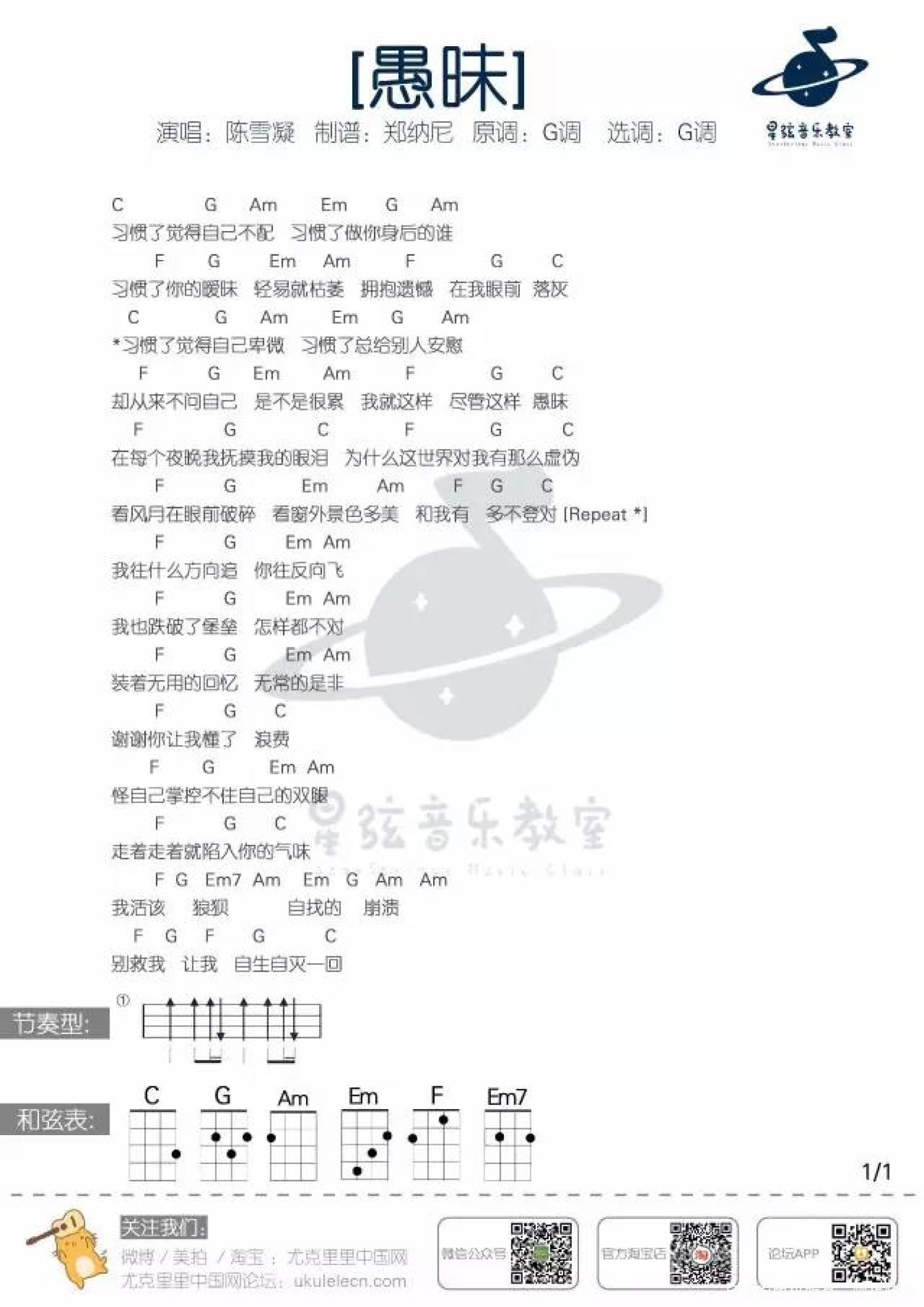 曲谱介绍: 习惯了觉得自己不配 习惯了做你身后的谁 from《愚昧》 第一次关注到汽水妹 是在快手上 看着她弹尤克里里的样子 悠然自得 声音清脆 那是一种真真切切 喜欢尤克里里的样子呢 愚昧   《愚昧》是独立音乐人陈雪凝发行的第二首单曲。其单曲作词来自于一只然,作曲来自于陈雪凝,编曲来自于周成,录音混音制作来自于成都1019录音室。该歌曲风格依然保持独立流行,其表达了人们在青春时期对爱情的失望到不满最后亦然。   尤克里里曲谱