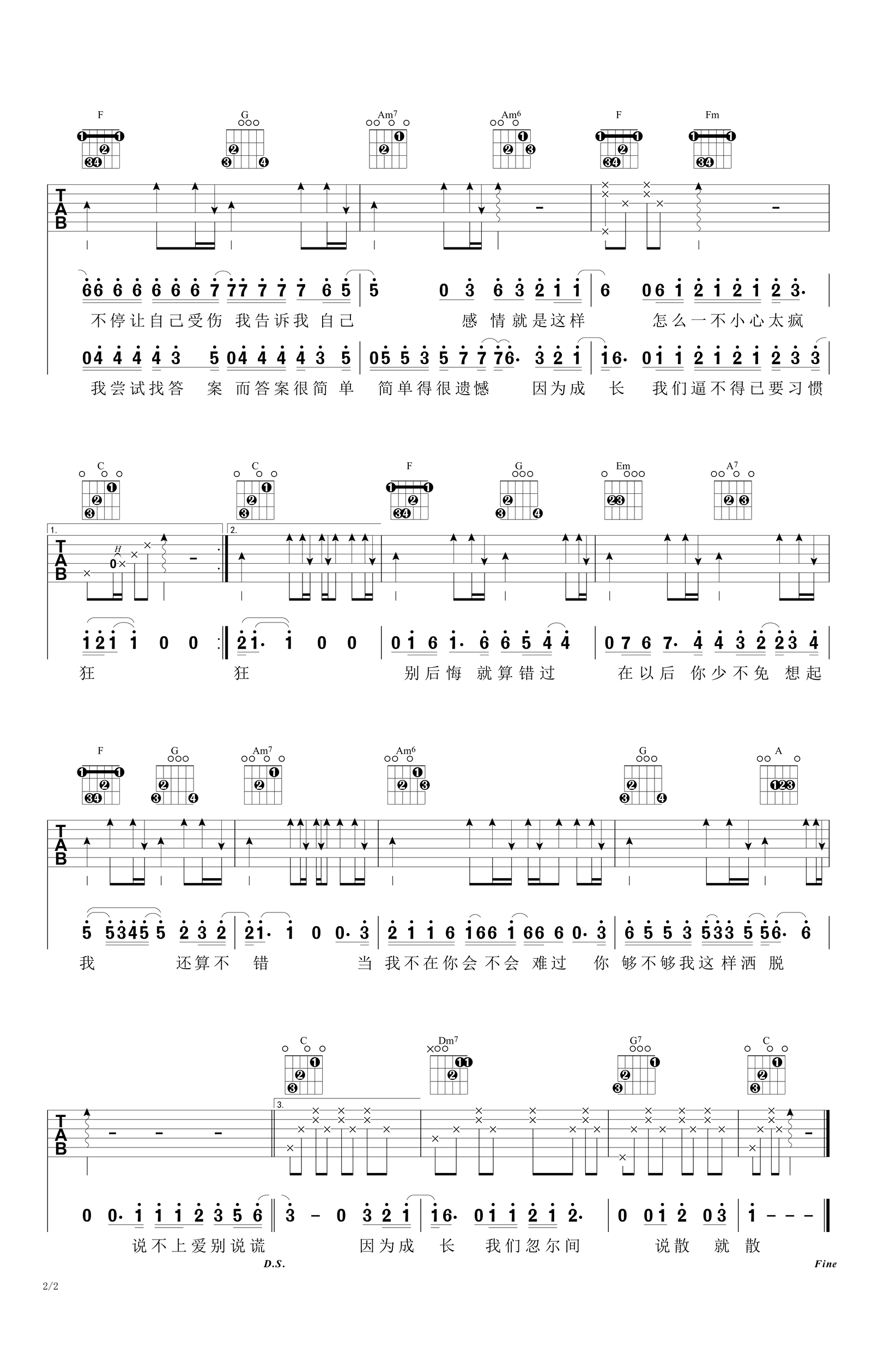 曲谱介绍: 说散就散吉他谱,袁维娅演唱的一首让人瞬间沦陷的分手情歌,电影《前任3》主题曲。《说散就散》吉他弹唱谱,C调和弦指法编配,两张高清图片六线谱。