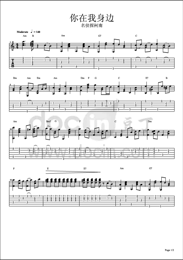 曲谱介绍: 你在我身边吉他谱由豆丁编配完成。这首歌曲是《名侦探柯南》的插曲,每次听到这首歌曲,都会让我们想起名侦探柯南里面的故事情节,让我们想起了儿时的那段时光。另外,这首别爱我像爱个朋友吉他谱也超级好听,小伙伴们有福啦,还不去练起来?