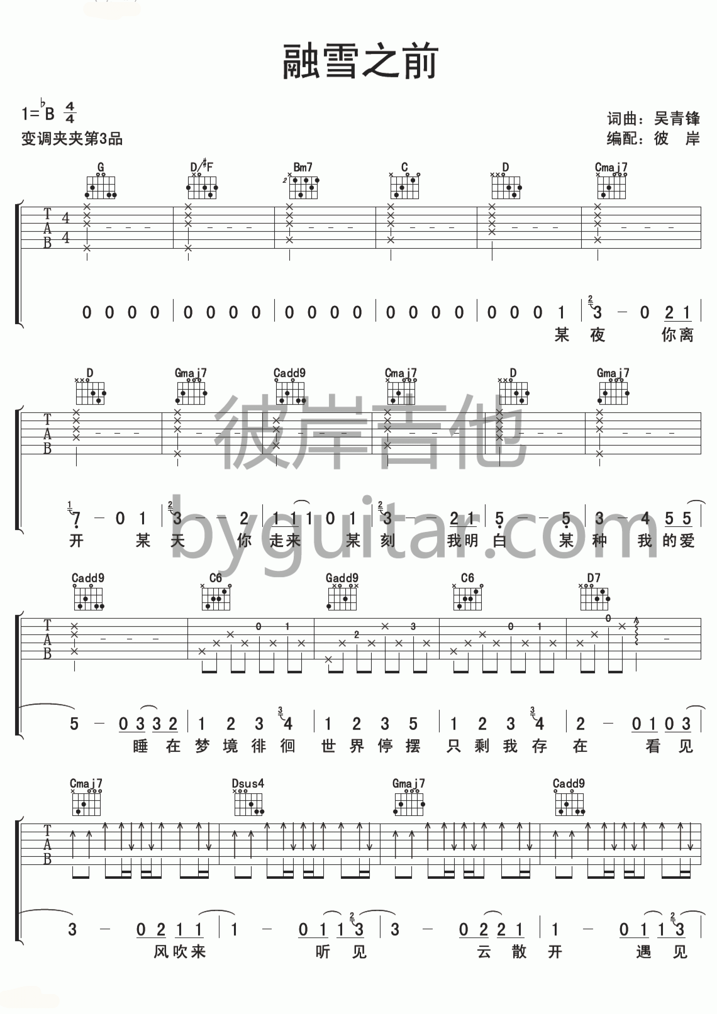 曲谱介绍: 融雪之前吉他谱采用了B调指法,由彼岸吉他编配完成。这首歌曲也是一首十分优秀的音乐作品,虽然它不像苏打绿其他音乐作品那样受欢迎,但那些喜欢他的人都说这首歌曲是自己偷偷藏在心里的宝藏。融雪之前这首歌曲总是每一次经起来都会给人带来不一样的感受,在这首歌曲里面体现了我想挽留冬夜里只给我一个背影就要离开的你,却因为某种悲伤,和某种温暖和舒适所羁绊的画面。号外:在这里小编要推荐这首回应吉他谱,它也很好听,大家赶快学习起来啦,不要犹豫!