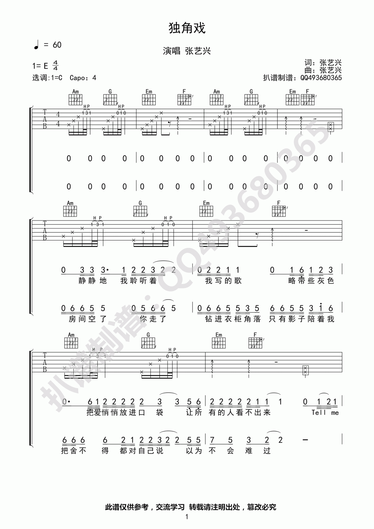 曲谱介绍: 张艺兴《独角戏》吉他弹唱谱,采用C调指法编配,共有3张高清图谱。