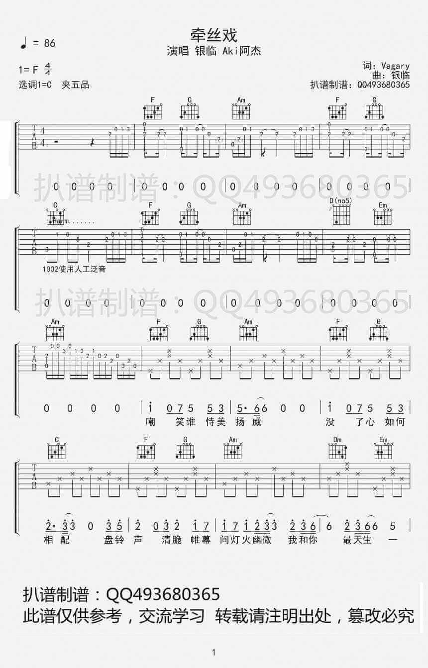 曲谱介绍: 牵丝戏吉他谱采用了F调指法,由扒谱制谱编配完成。古风类型的歌曲越来越受到大众的喜爱。《牵丝戏》这首歌曲是由银临和阿杰一丝演唱的,在这首音乐作品之中,我们能够感受到满满的古风色彩,叫人情不自禁陶醉其中。在副歌部分的戏腔,让很多人都惊艳万分,很多人都对副歌部分的戏腔情有独钟。银临用她温婉干净的声线为这首歌曲增添了韵味,这段旋律意境唯美,让人久久不能忘怀。TIPS:在这里向大家推介另外一首,它就是秋蝉吉他谱啦,非常动听的一首曲子!