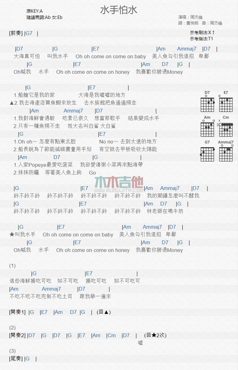 曲谱介绍: 水手怕水《水手怕水_》吉他弹唱谱,共有1张高清图谱,免翻页排版设计。