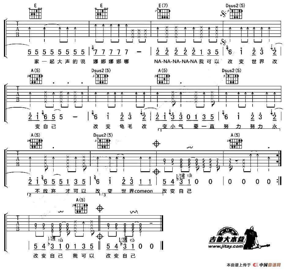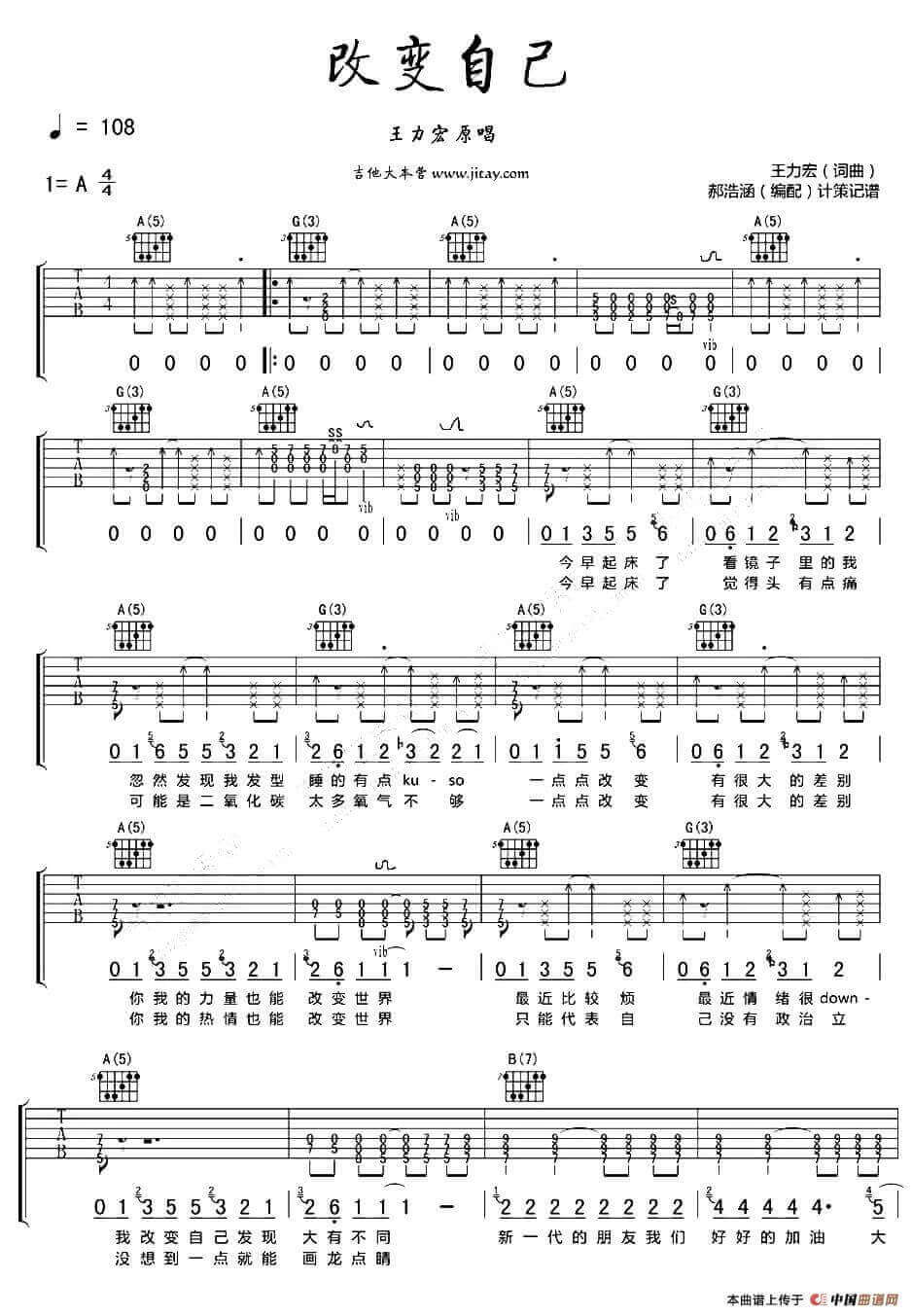 曲谱介绍: 改变自己吉他谱采用了A调指法,由吉他大本营编配完成。《改变自己》是王力宏演唱的歌曲,由王力宏作词作曲,收录在王力宏发行的同名专辑《改变自己》中。王力宏写这首歌曲,除了砥砺自己外,同时也希望告诉众听者们不要害怕改变,要勇于改变自己。《改变自己》是一首十分热血,摇滚风格的歌曲,这首歌曲也不像以往的歌曲那么激昂热烈,而是从心底出发,用沉淀的心发现平凡中的感动。在这首歌曲里,节奏轻快,很有记忆点。另外,这首爱海滔滔吉他谱也超级好听,小伙伴们有福啦,还不去练起来?
