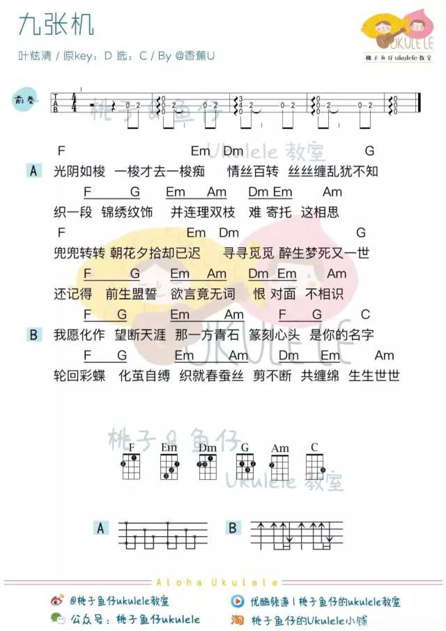 曲谱介绍: 《九张机》是古装爱情网络剧《双世宠妃》的主题曲,这部剧由超高人气小说《爆笑宠妃》改编,由元德执导,杨十夜编剧,赵洁、杨朔担任总制片人,张志炜、李阳担任制片人,大胆启用新人演员,共同演绎了一部腹黑欢喜冤家的爱情故事。《双世宠妃》打破以往甜爱玛丽苏剧的单线套路,在剧情设定中,不再傻白甜的女主曲檀儿与男主墨连城相爱后,成为一对精明腹黑的欢喜夫妻,在携手面对争储危机时默契十足,所向披靡。 尤克里里曲谱