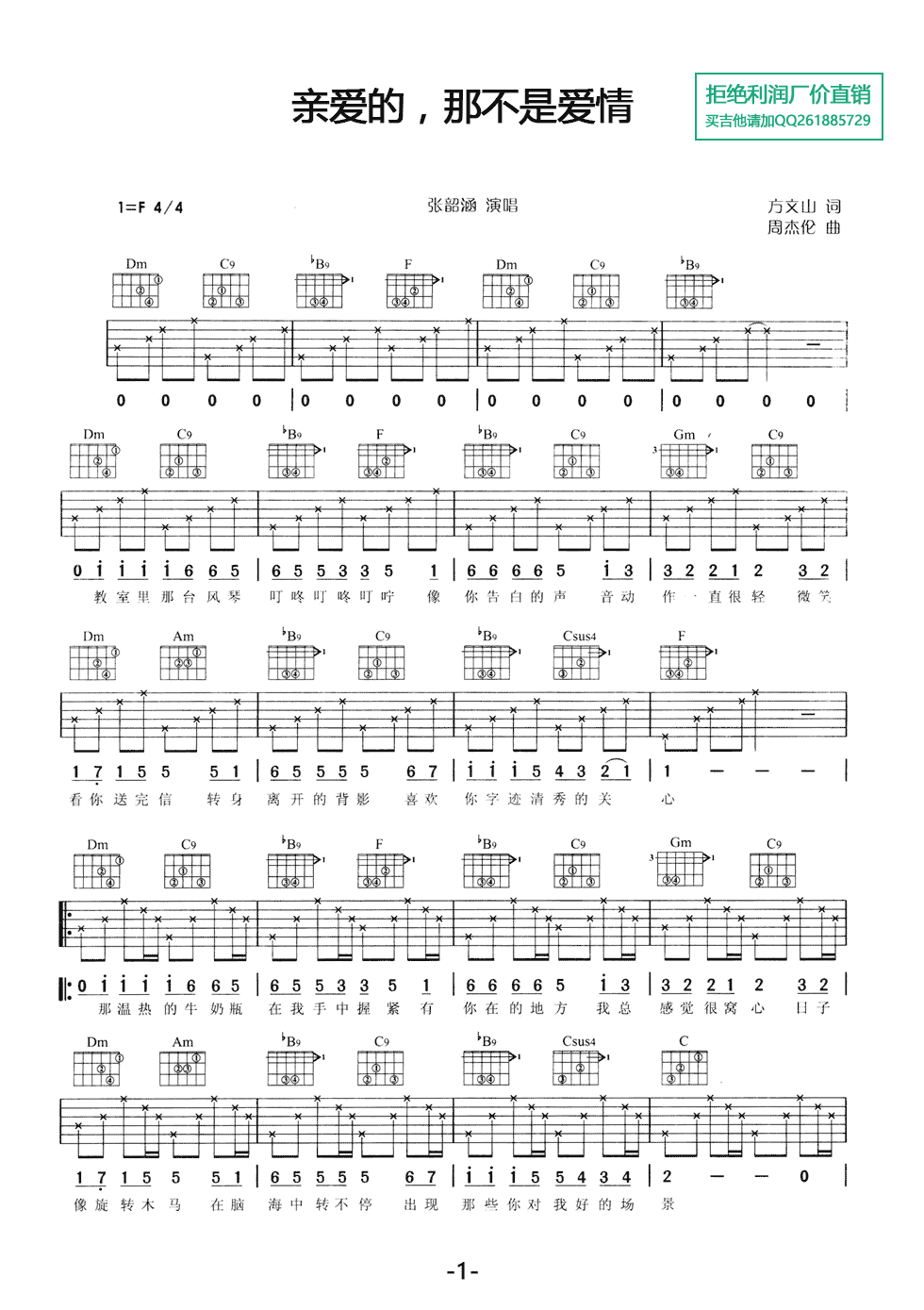 曲谱介绍: 亲爱的,那不是爱情吉他谱采用了F调指法,旋律动人。《亲爱的,那不是爱情》是张韶涵演唱的一首歌曲,由音乐人周杰伦谱曲,方文山作词,同时,这首歌曲还是电视剧《宫-野蛮王妃》的片尾曲。这是一首由周杰伦为张韶涵特地量身打造的歌曲,张韶涵首次演唱慢板 R&B 唱法,这首歌曲表达的是姐弟恋之间的感情故事,张韶涵的嗓音像精灵一般灵动,慢板 R&B 唱腔曲风,获得不少歌迷们的喜爱。听兄弟说,日落大道吉他谱听了耳朵会怀孕,快快学起来,学完去撩妹!