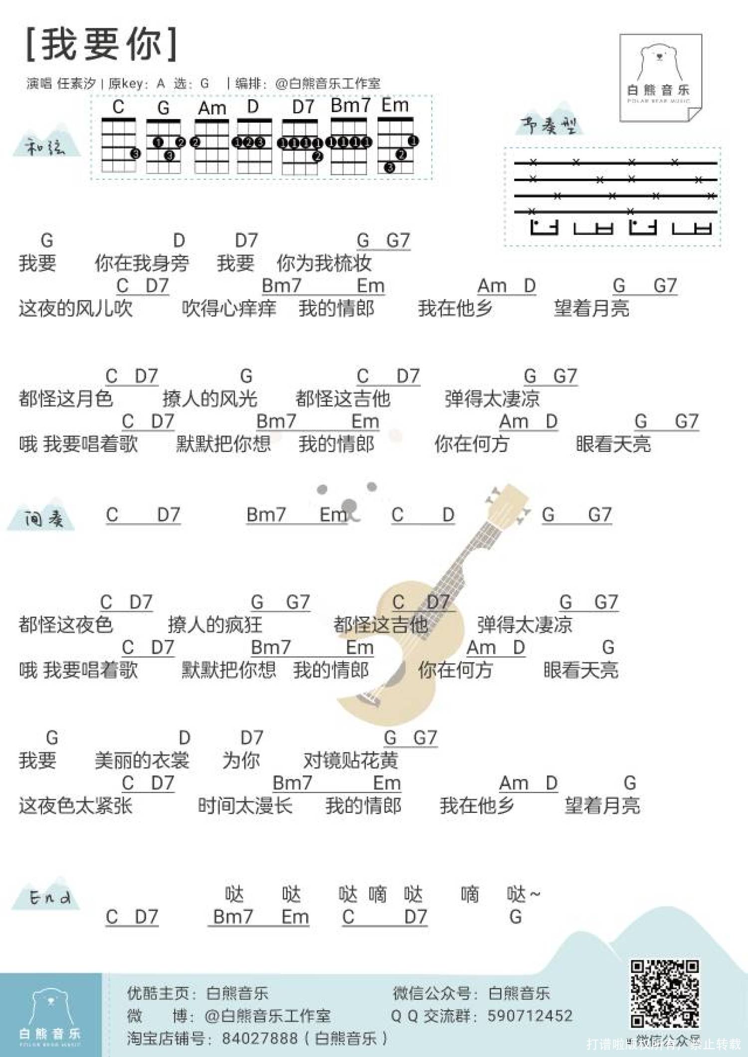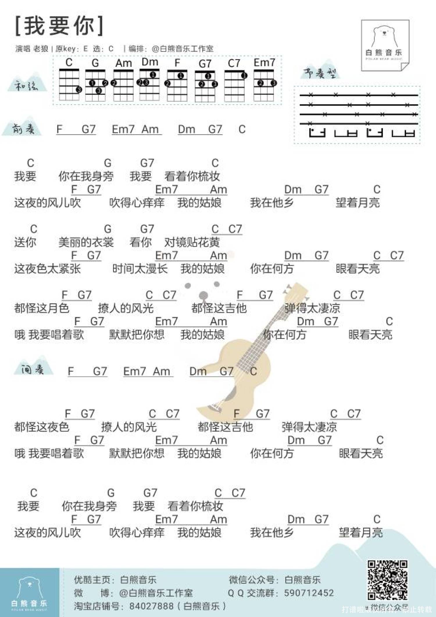 曲谱介绍: 〈我要你〉是由樊冲作词、作曲的歌曲,起初作为话剧《驴得水》插曲,由任素汐、老狼演唱。 歌曲气质干净,旋律优美 ,歌词简单动人,直达人心; "既能帮助观众释放在强烈戏剧性驱动下累积的情绪,又能突出人物的情感,但还不能矫情 " 樊冲创作该曲时多方面考虑之后决定写一点剧本之外、人物之中的东西。樊冲认为话剧中的张一曼属于交际花,所以应该会经常哼起一些靡靡之音,从而樊冲决定了该曲的基调。同时,樊冲认为张一曼会在歌声回忆过去或者想要得到些什么,所以将歌曲命名为〈我要你〉。 后〈我要你〉被选为电影《驴得水》推广曲及主题曲,由老狼、任素汐演唱。老狼的歌声演绎得更深层,低沉而温柔的声音像是讲述一个“浪漫、揪心”的故事。 由任素汐独唱的版本,除了保留了原角色情感之外,又融合了轻快的节奏,任素汐以戏中人的口吻婉转讲述一个“温柔”又“炎凉”的故事,似应和,似叹息,区别于老狼的演唱,任素汐在歌曲中表现地更加柔和令人心动; 2017年3月27日,该曲获得第二十四届东方风云榜动感101年度金曲奖;   视频弹唱教学 尤克里里曲谱 男生谱 女生谱