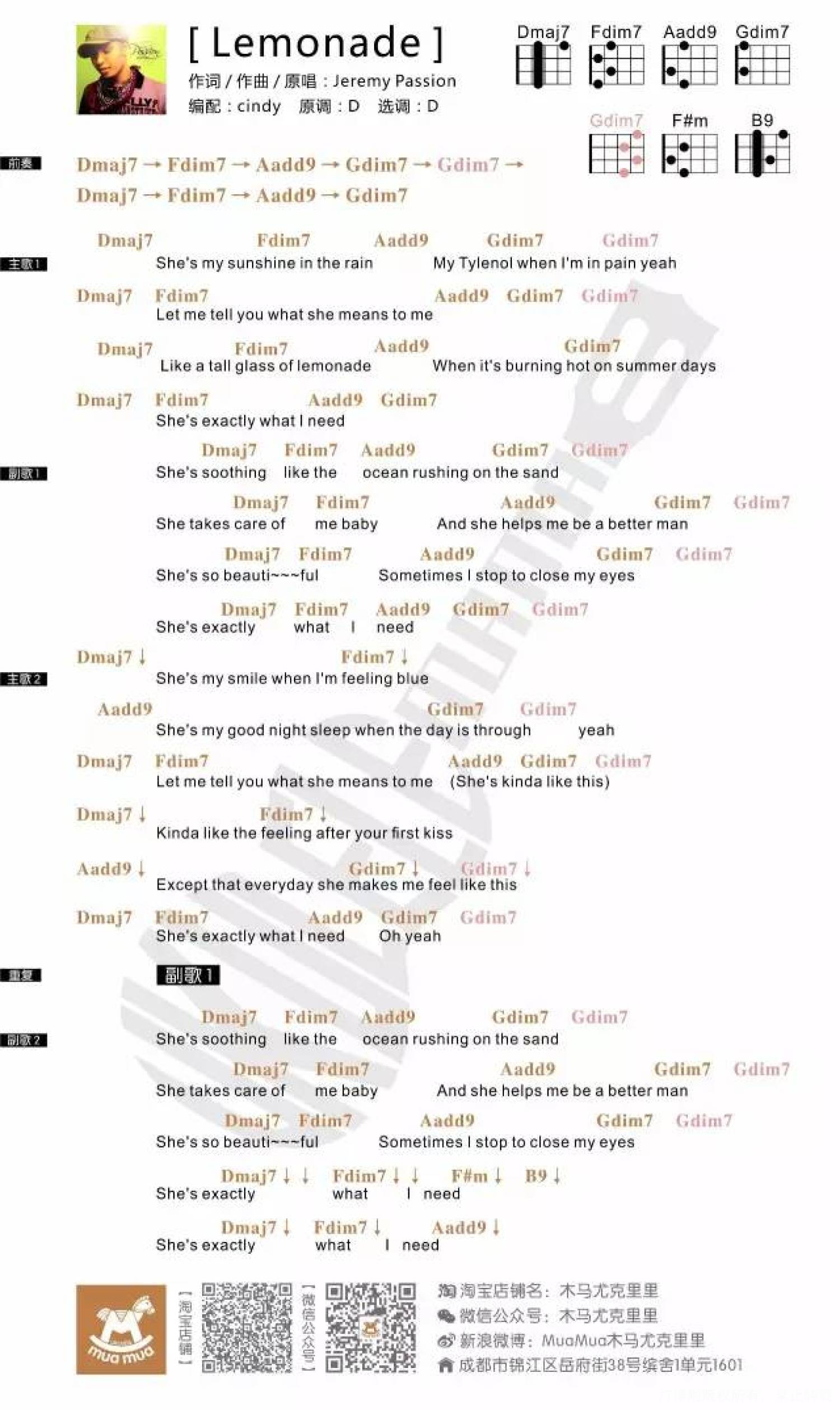 曲谱介绍: Jeremy Passion 美国著名YouTube音乐人 擅长使用吉他和ukulele 这首Lemonade可能是他2004年的原创作品 先来听听吉他版: Lemonade - Jeremy Passion feat. Luke Edgemon & Tori Kelly 最后是cindy的翻弹(唱不来) 尤克里里曲谱