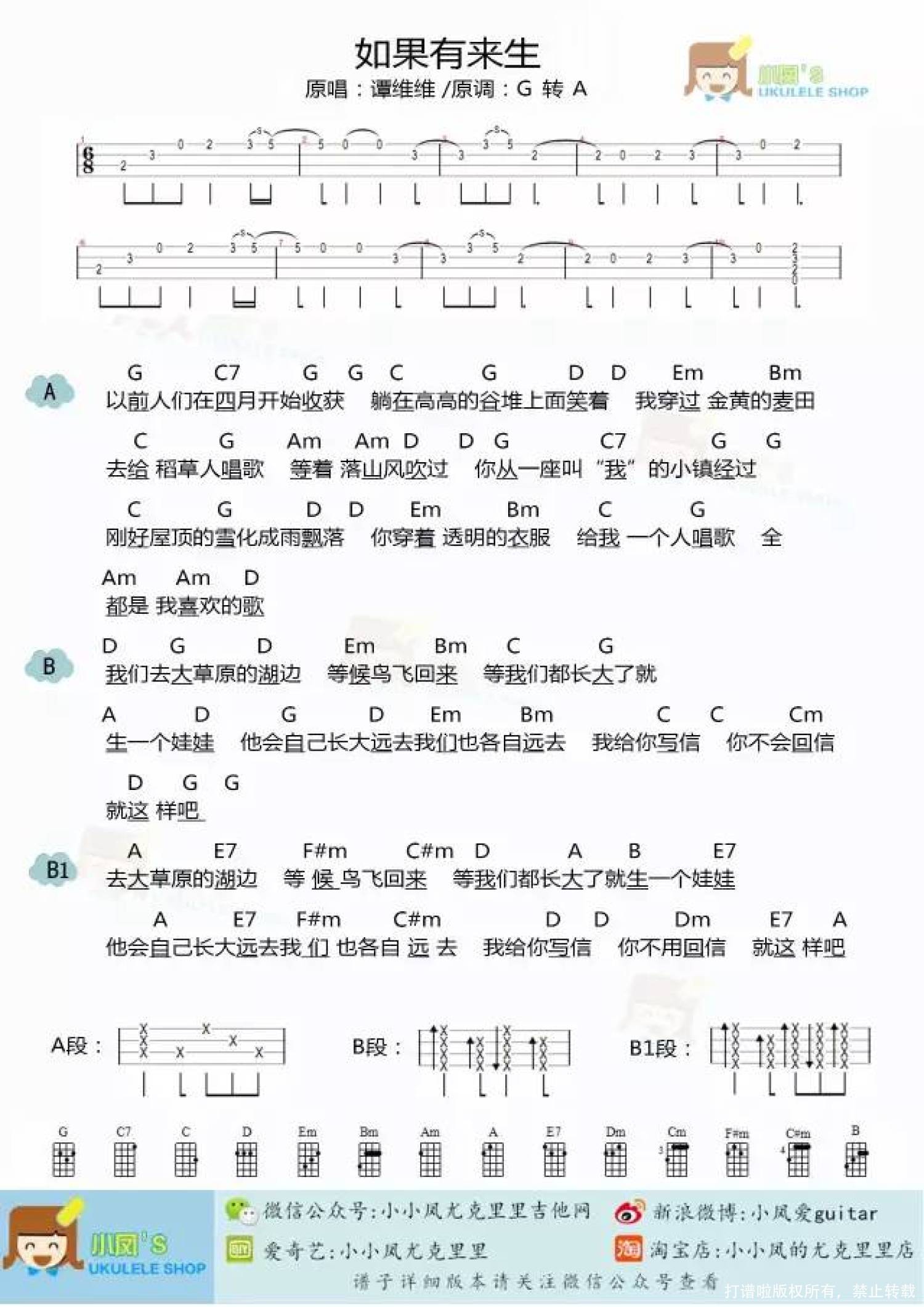 曲谱介绍: 《如果有来生》是歌手谭维维演唱的一首歌曲。由高晓松作词,牛奶@咖啡组合成员格非作曲,收录在2010年3月30日发行的谭维维第四张音乐专辑《谭某某》中。 也是一首被誉为世外桃源代表作的歌曲,有着轻快的旋律,可是听完却总让我觉得有一种明朗的伤感。 听了几遍歌曲再看歌名,恍然大悟为什么明朗轻快的曲调搭配着似乎不知所云的歌词,却让人那样难过,因为内里是浓厚得化不开的悲伤绝望。 总觉得这首歌前面的画面描述的太美好 美好得像是童话一般 后面却又唱的那么用力 像是身体里的难过 再也不可压抑般汹涌而出。 如果有来生 如今的我们已不再年轻 当我们在日复一日 安定庸常的生活中慢慢沦陷 当我们逐渐忘记了无力和单薄的梦想 这首《如果有来生》 却再度让我们习惯了无奈现实的心隐隐刺痛 把来生唱进歌里,然后回头证明真实的人生。 MV中谭维维像个 初生的婴儿一样纯净而欢乐 却也是在这欢乐中 隐隐着悲伤 大概明朗的感伤 最是无奈。 曲风或许温暖而诗意 可在歌曲诗意的修辞背后 字字句句 都关乎着那些 人生中不可能被实现的美好爱情 关乎着那些岁月里 无法被磨灭的遥远憧憬。 虽然有着难过 可是听完还会觉得这是一首灵性的歌 觉得高晓松是在呈现 就像他本人一样: “爱情与自由,是世界最美好角落的两扇大门。爱情本身是美丽的,错过的爱情也是美丽的,分离是无可奈何同样也是美丽的" 这或许就是人生,是生命遗憾的美丽 可是一切都是好的 歌曲MV 尤克里里曲谱 和弦谱 祥谱