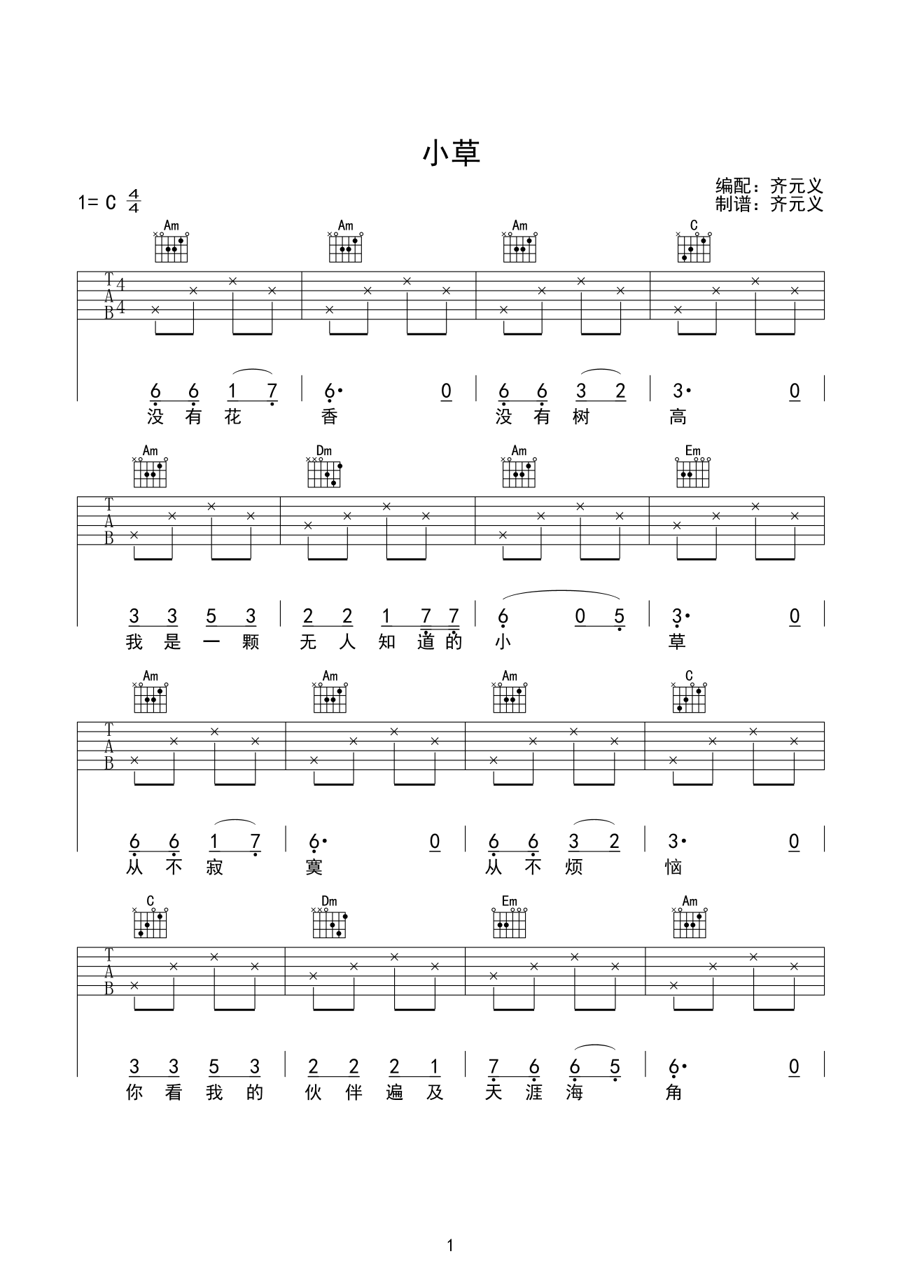 曲谱介绍: 小草吉他谱采用了C调指法,由齐元义编配完成。TIPS:在这里向大家推介另外一首,它就是推开世界的门吉他谱啦,非常动听的一首曲子!