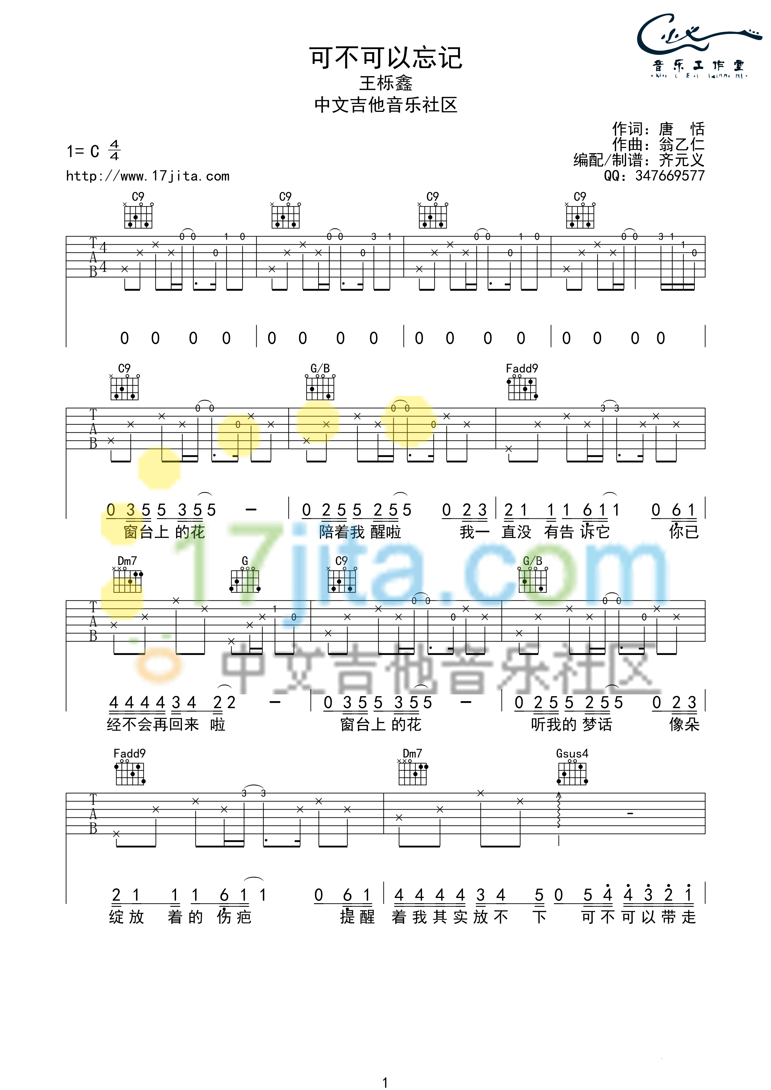 曲谱介绍: 可不可以忘记吉他谱采用了C调指法,由中文吉他音乐社区编配完成。王栎鑫将这首歌曲的悲伤用自己的方式演绎的淋漓尽致。这首阳光宅男吉他谱也很帅,快点去学习吧,没学会的小伙伴要继续加油喔,稳!