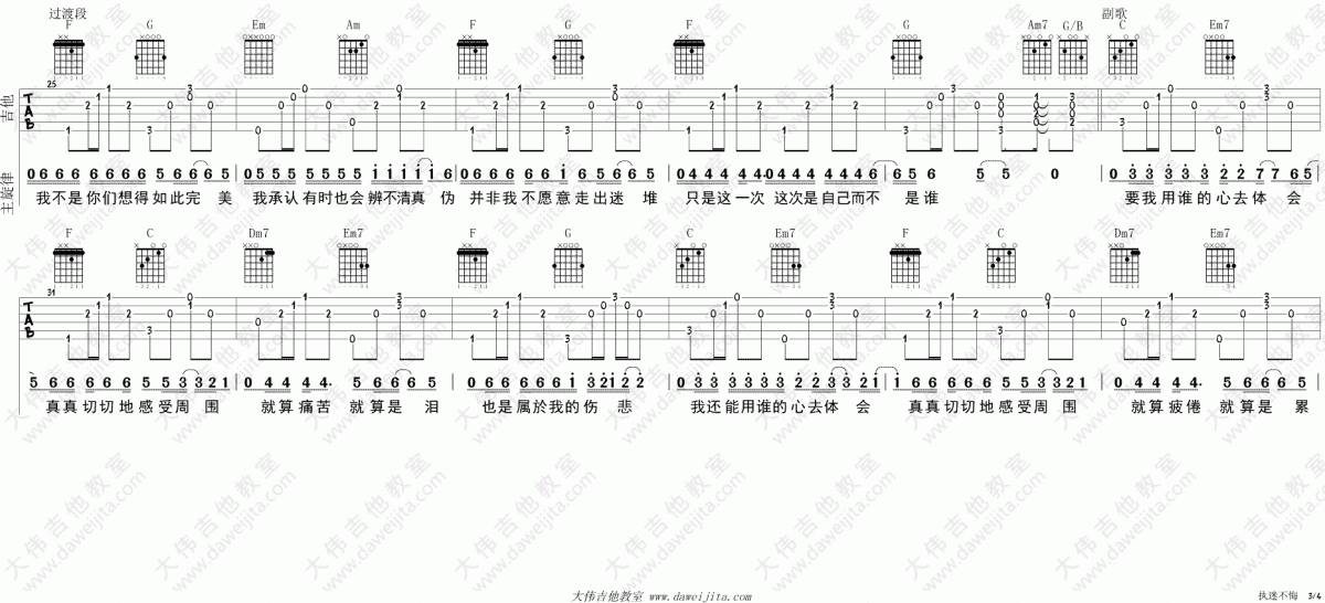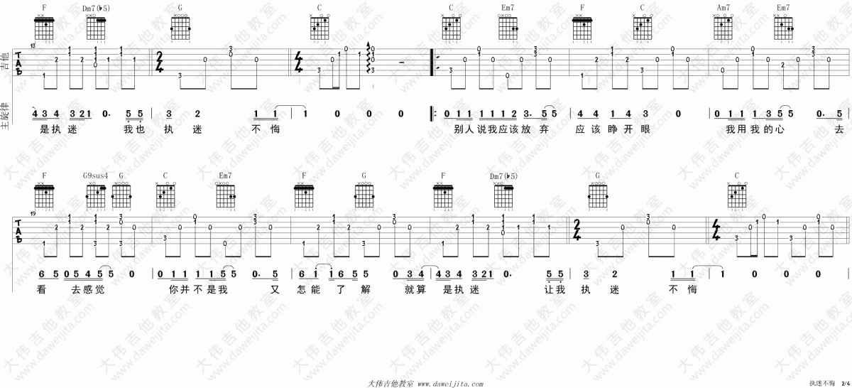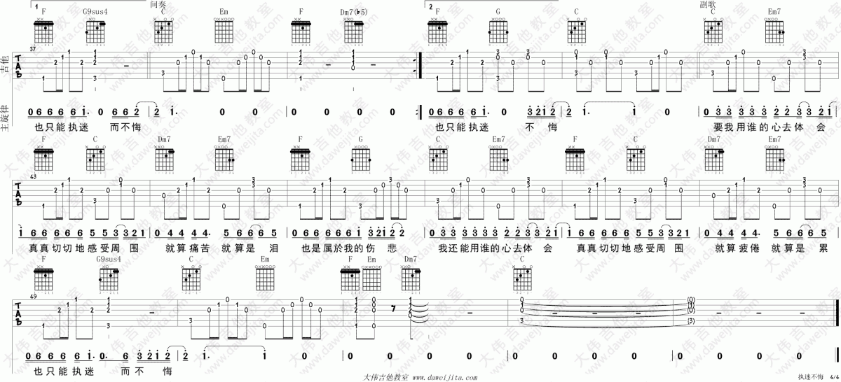 曲谱介绍: 执迷不悔《执迷不悔_C调》吉他弹唱谱,采用C调指法编配,共有4张高清图谱。