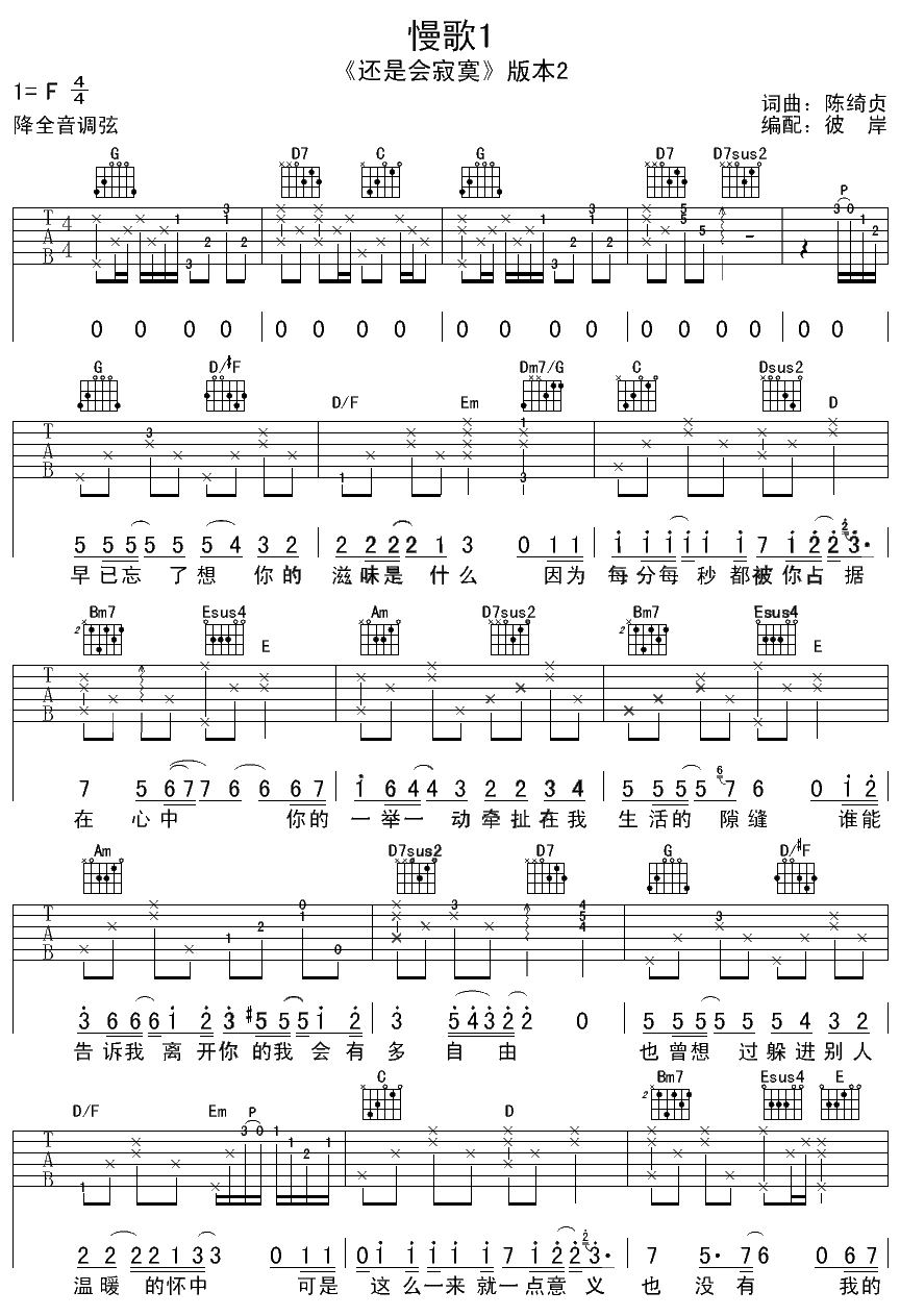 曲谱介绍: 慢歌1吉他谱采用了F调指法,由彼岸编配完成。记得很久之前有听过这样一句话,伤心的人才会听慢歌,在缓慢的旋律之下,心中的悲伤在一瞬间涌现出来,让人陷入崩溃之中。陈绮贞的嗓音十分的甜美温柔,但在这首歌曲之中又夹杂着一点点悲伤的气息,让人感受到了歌者想要传递的情绪。听兄弟说,一人份晚餐吉他谱听了耳朵会怀孕,快快学起来,学完去撩妹!