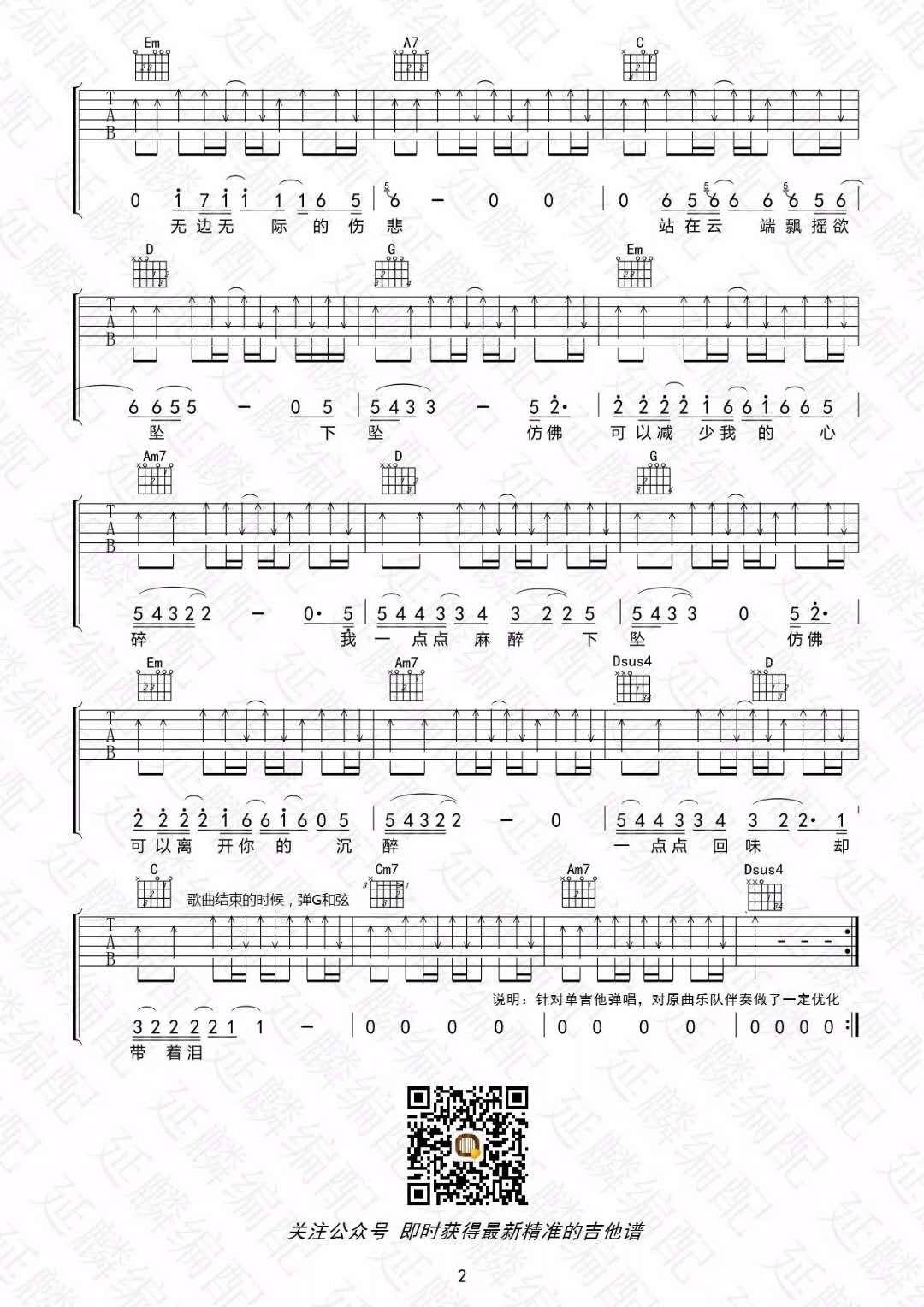 曲谱介绍: 汪峰《下坠现场版_》吉他弹唱谱,共有2张高清图谱,免翻页排版设计。