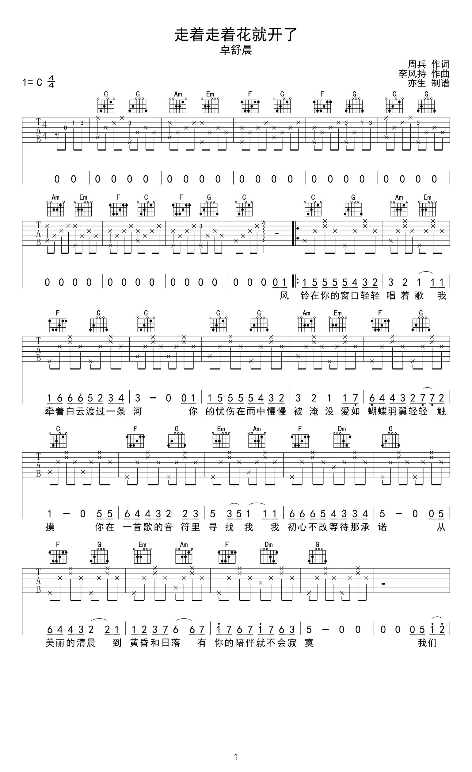 曲谱介绍: 走着走着花就开了吉他谱,卓舒晨演唱的一首网络热门暖心情歌,《走着走着花就开了》吉他弹唱谱,选用原调C调编配,不用变调夹,完整版共两张图片六线谱。