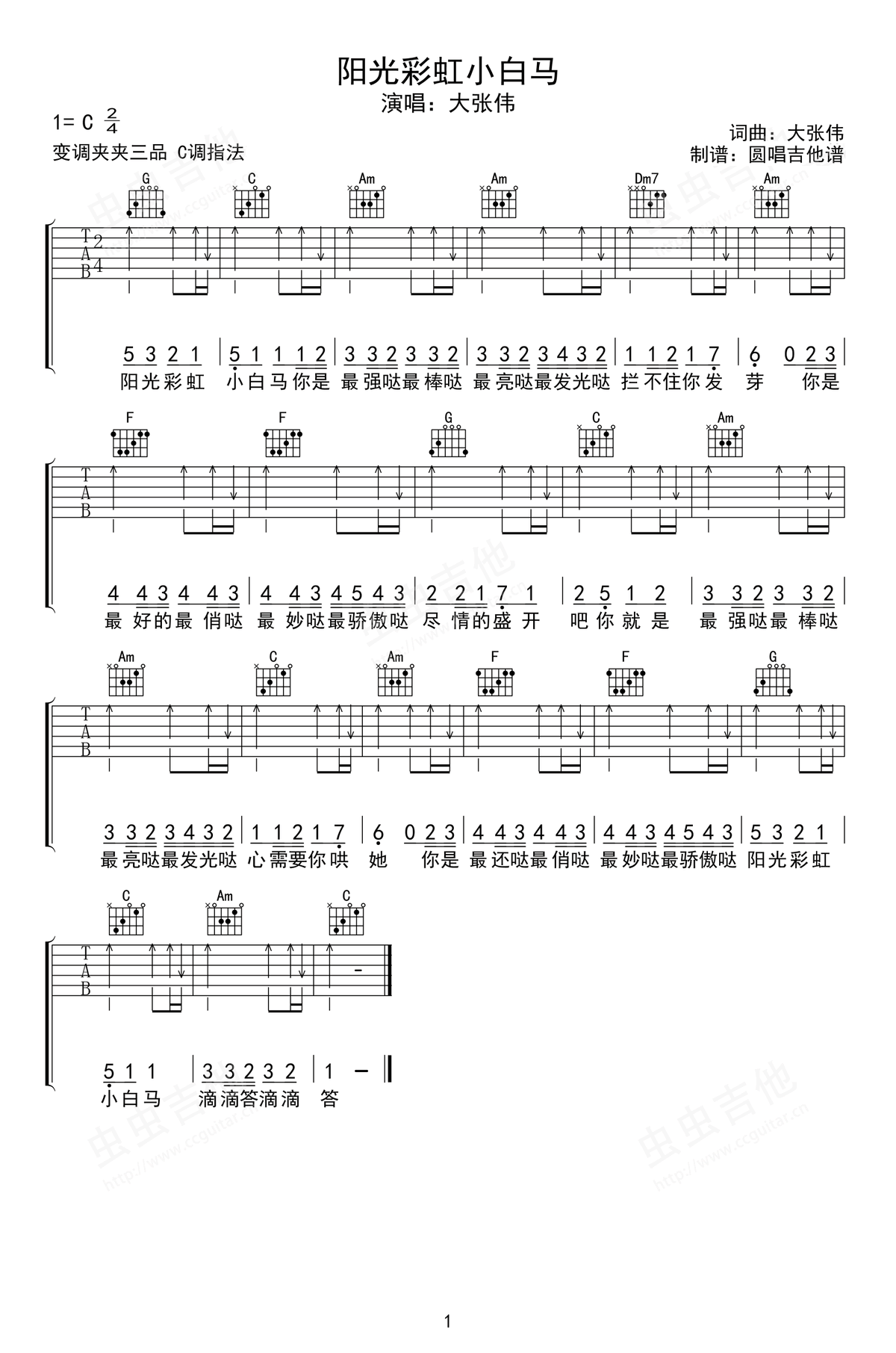 阳光彩虹小白马吉他谱 - 大张伟 - C调吉他弹唱谱