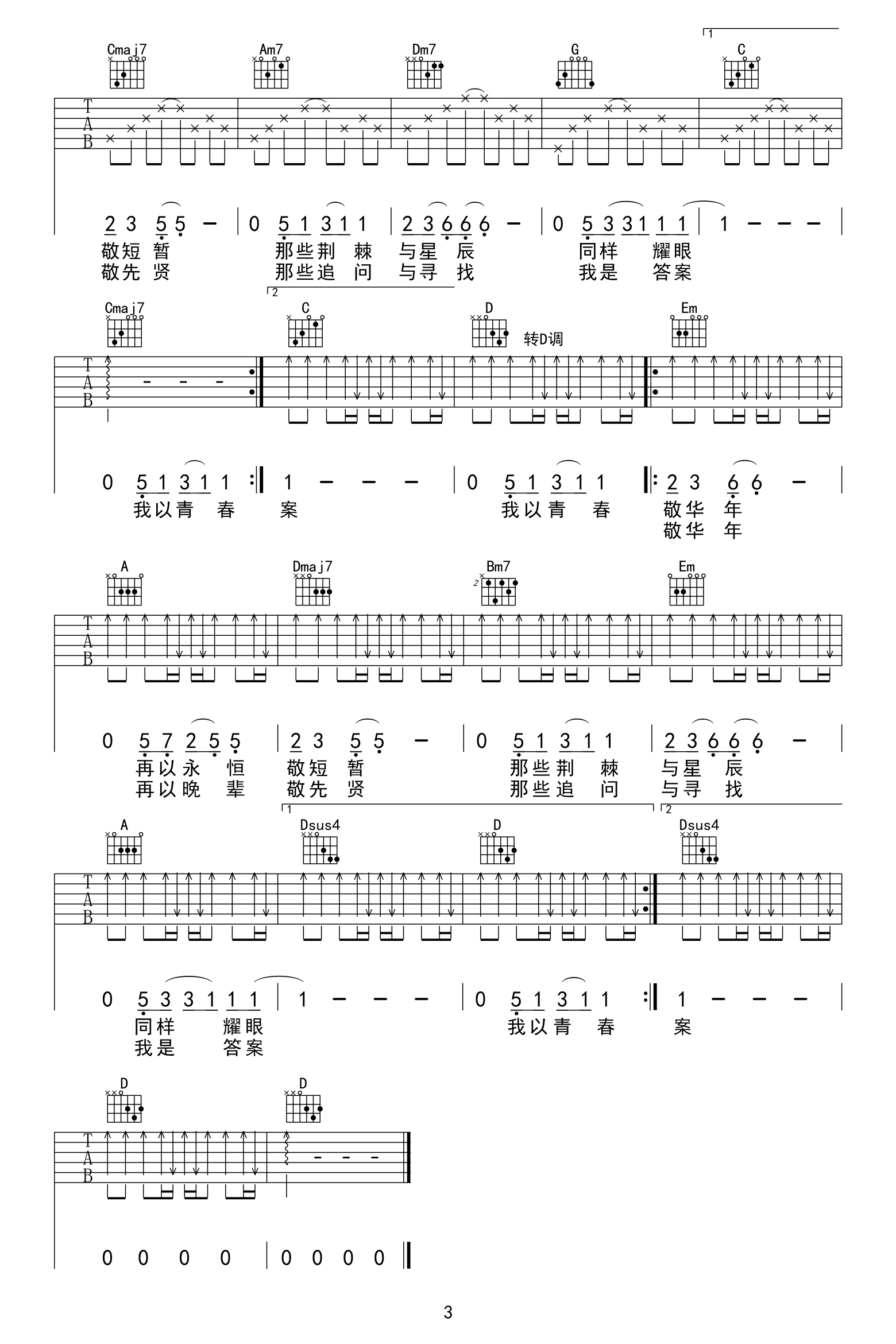 曲谱介绍: 我以青春敬华年吉他谱,张杰演唱的新歌单曲,旋律婉转悠扬,歌词富有诗意、饱含深情叙说着年轻人的奋进和追梦之路,歌声承载着我们对于青春年华的感受,娓娓唱出了关于时光的探寻和答案。 《我以青春敬华年》吉他弹唱谱,C转D指法,三张高清图片六线谱。把青春融进祖国山河,将梦想注入人生征途,少年逢盛世,奋斗正当时!