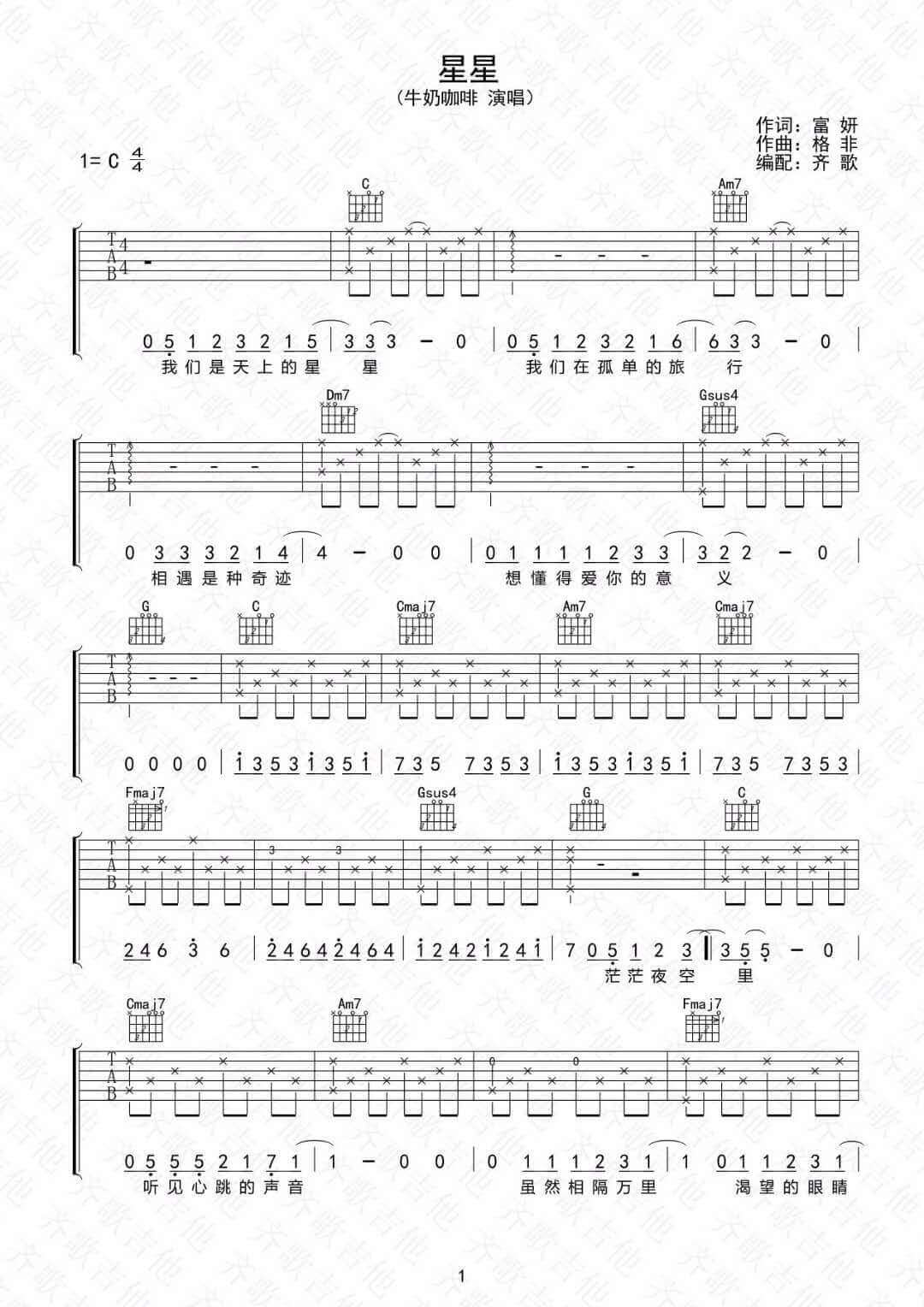 曲谱介绍: 星星吉他谱采用了C调指法,由齐歌吉他编配完成。温柔如牛奶咖啡,温暖如牛奶咖啡,《星星》这首歌曲是创作给在这世界上的一群特殊人群——自闭,孤独症儿童。在《星星》这首歌曲中加入了童声部分,更突显了这首歌温暖的力量,他们希望能够用这首歌曲的力量呼吁更多的人关注这样一个特殊的群体,他们同样渴望着闪耀的光芒。 每一个人都渴望散发自己的光芒,每一个人都有资格告诉大家,他是星星。TIPS:在这里向大家推介另外一首,它就是邮差吉他谱啦,非常动听的一首曲子!