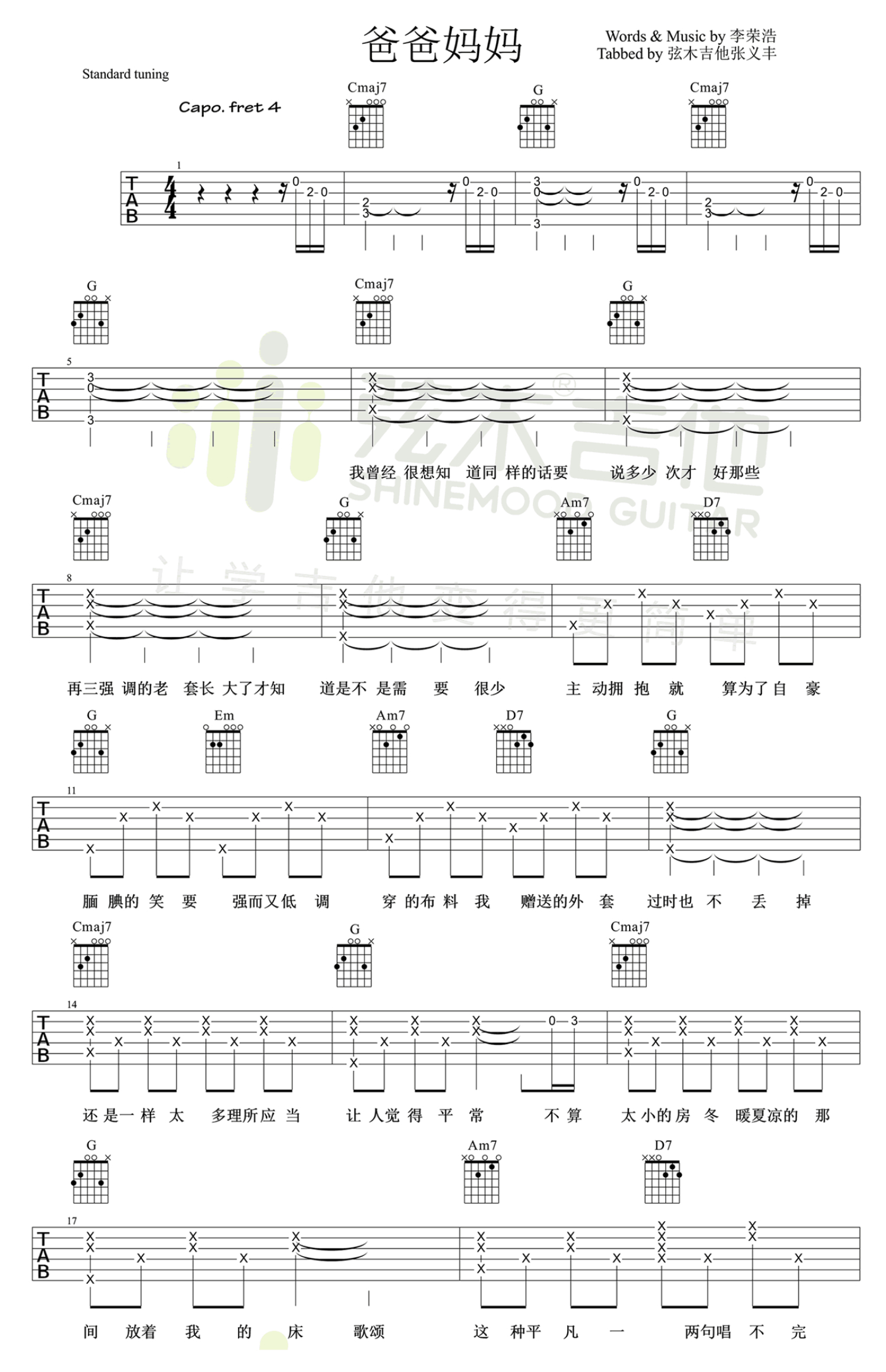 曲谱介绍: 爸爸妈妈吉他谱,李荣浩演唱的一首有关亲情题材的创作歌曲,原调变调夹夹四品,如果觉得高了,男生可以调整到2-4品,女生夹六品位置。身无饥寒,父母未曾亏我;人无长进,我以何对父母。不煽情的歌曲,表达对父母的爱。