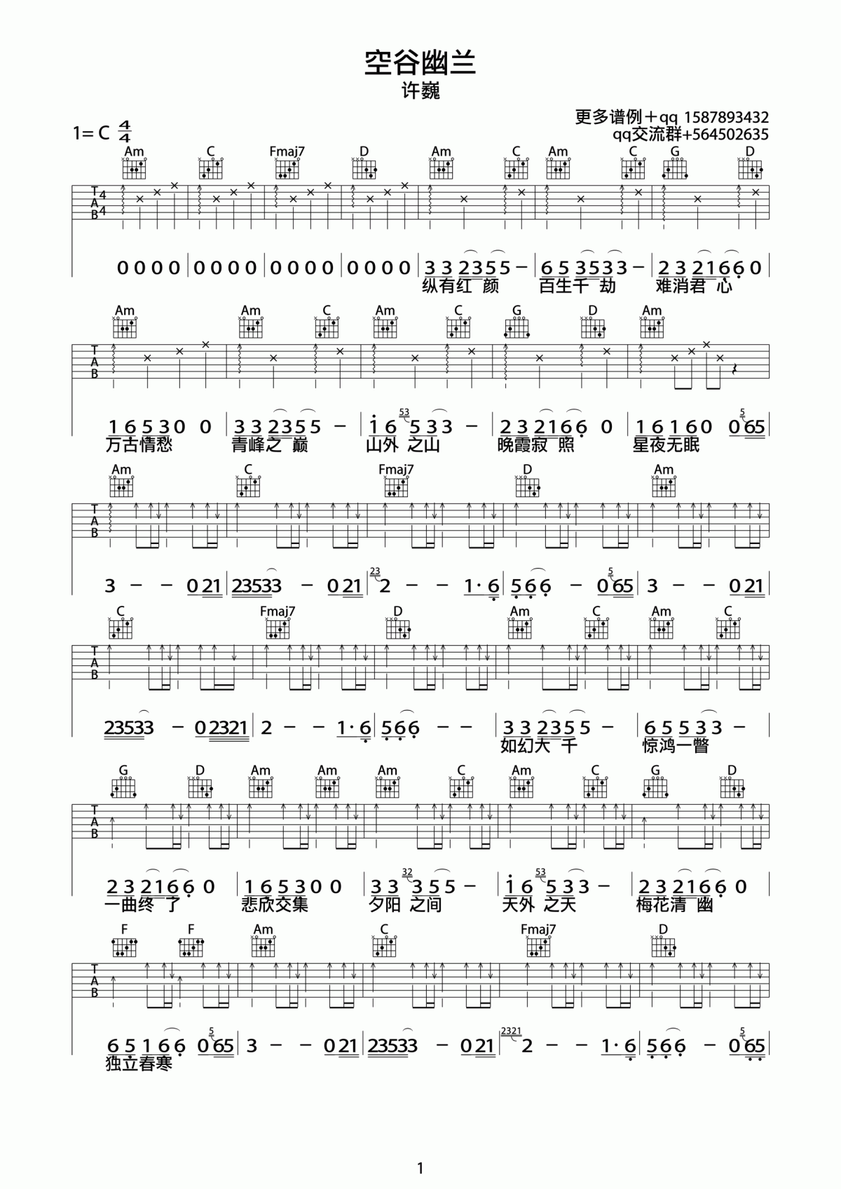 曲谱介绍: 许巍《空谷幽兰》吉他弹唱谱,采用C调指法编配,共有2张高清图谱,免翻页排版设计。
