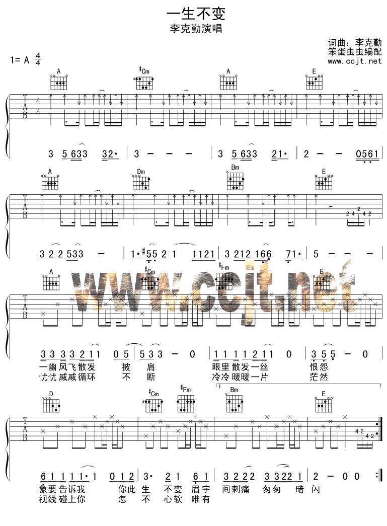 一生不变吉他谱 - 李克勤 - A调吉他弹唱谱