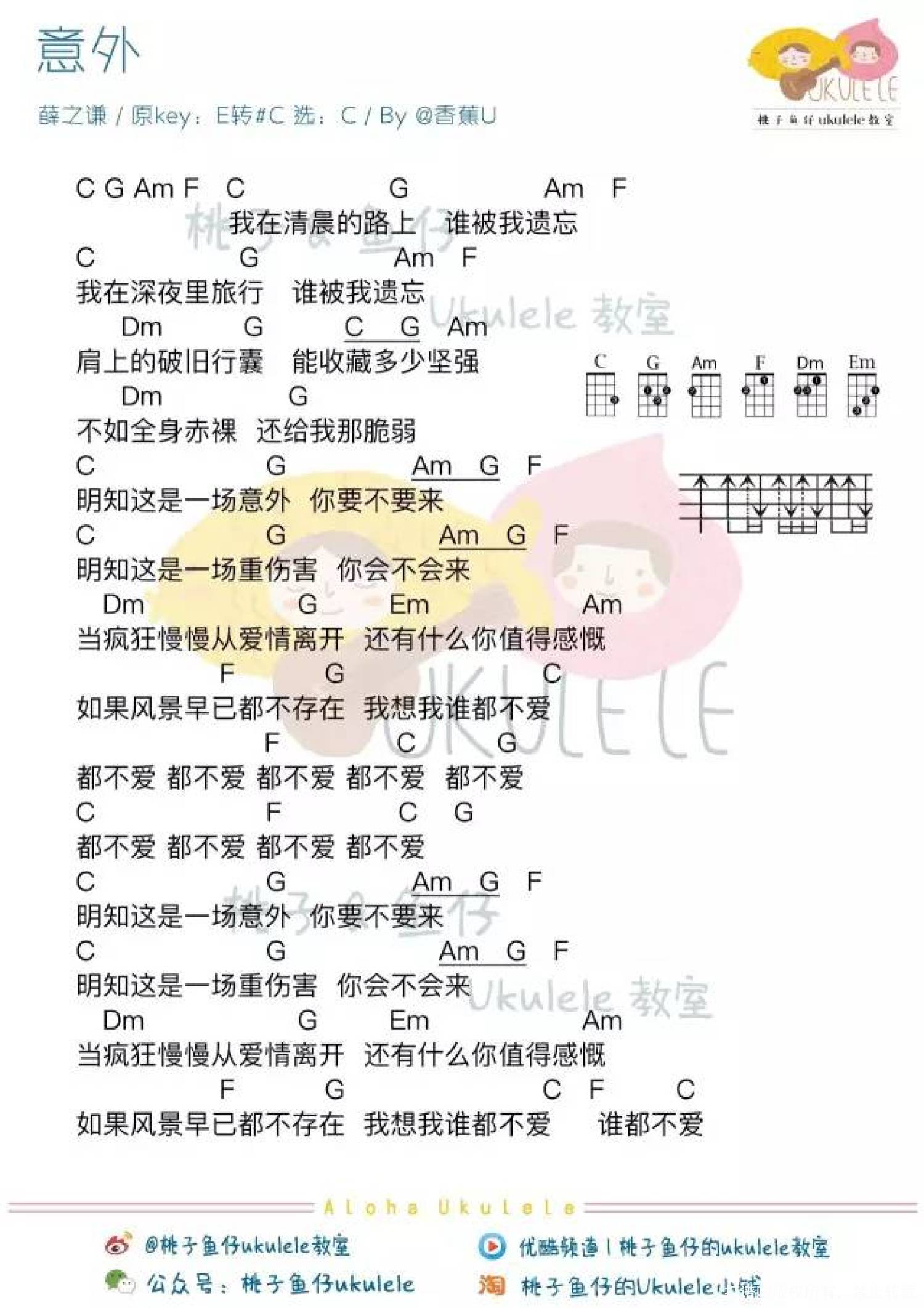 曲谱介绍:  薛之谦在为自己的专辑收歌时遇到《意外》这首歌,虽然不是自己的创作,但他却十分钟爱,更没想到这首歌曲的作者就是自己曾非常喜欢的Hebe(田馥甄)的《寂寞寂寞就好》的作者杨子朴,令薛之谦大感人生中充满了未知的惊喜。 如果过往的薛之谦还会给你白面小生的印象,那这首歌里硬朗摇滚的他,一定会让你意外。这是一首以背包旅行展开的歌,弦乐和钢琴交织出公路电影般的氛围,就为了呈现歌词中所写,明知是意外,也要闯一闯,哪怕赤身露体,也要有直面脆弱的勇气。 尤克里里曲谱